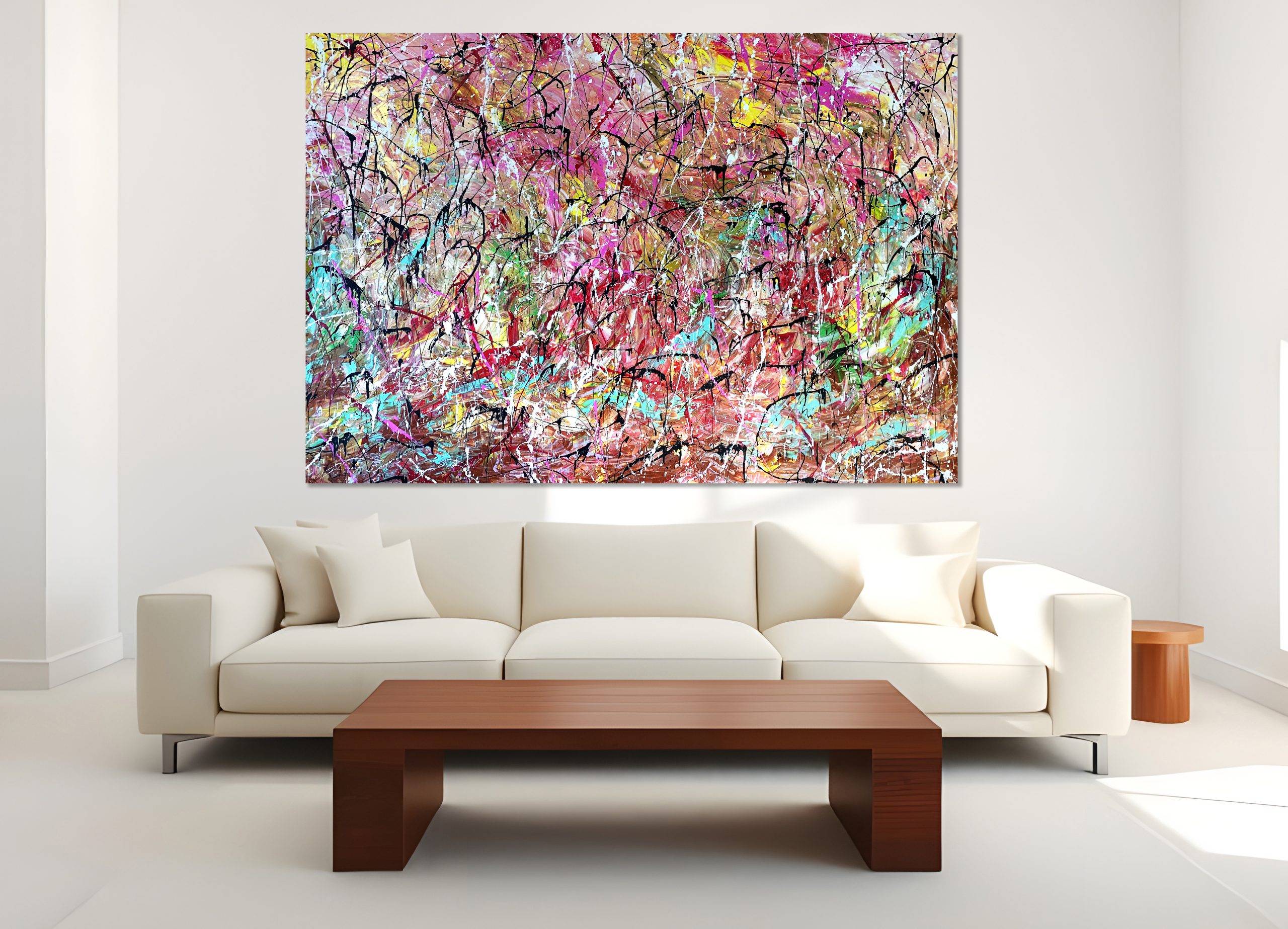 This artwork is painted on professional-grade canvas stretched and sealed with varnish. The canvas has dimensions of 168 cm in width by 116cm in height. The sides of the painting are painted black.