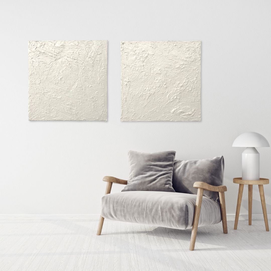 Signed on the side. A set of two abstract paintings with deep textured depth. In beige / grey / eggshell, and grey border. Signature on the side. Triple gloss finish.