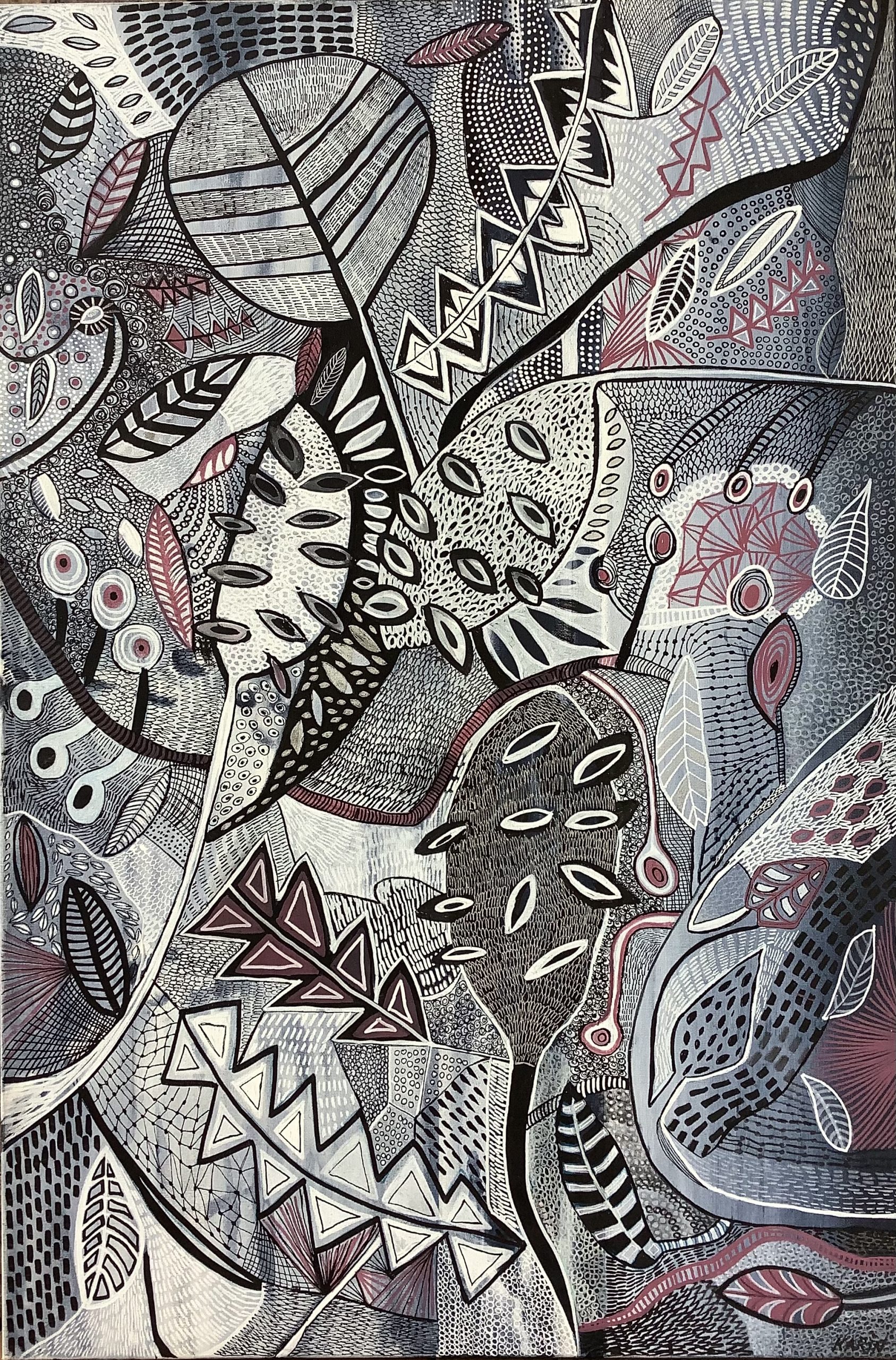 Cold Burn is an abstract botanical painting with a focus on banksia seed pods and leaves. Colours are steal greys black and white and a wine red colour incorporated with many patterns and detailed mark making. Â Autumn and winter are the season for cold burn to prepare and protect the bush from fires. The land may lose some of its green vegetation but the beauty is that it will regenerate gain colour and grow again.