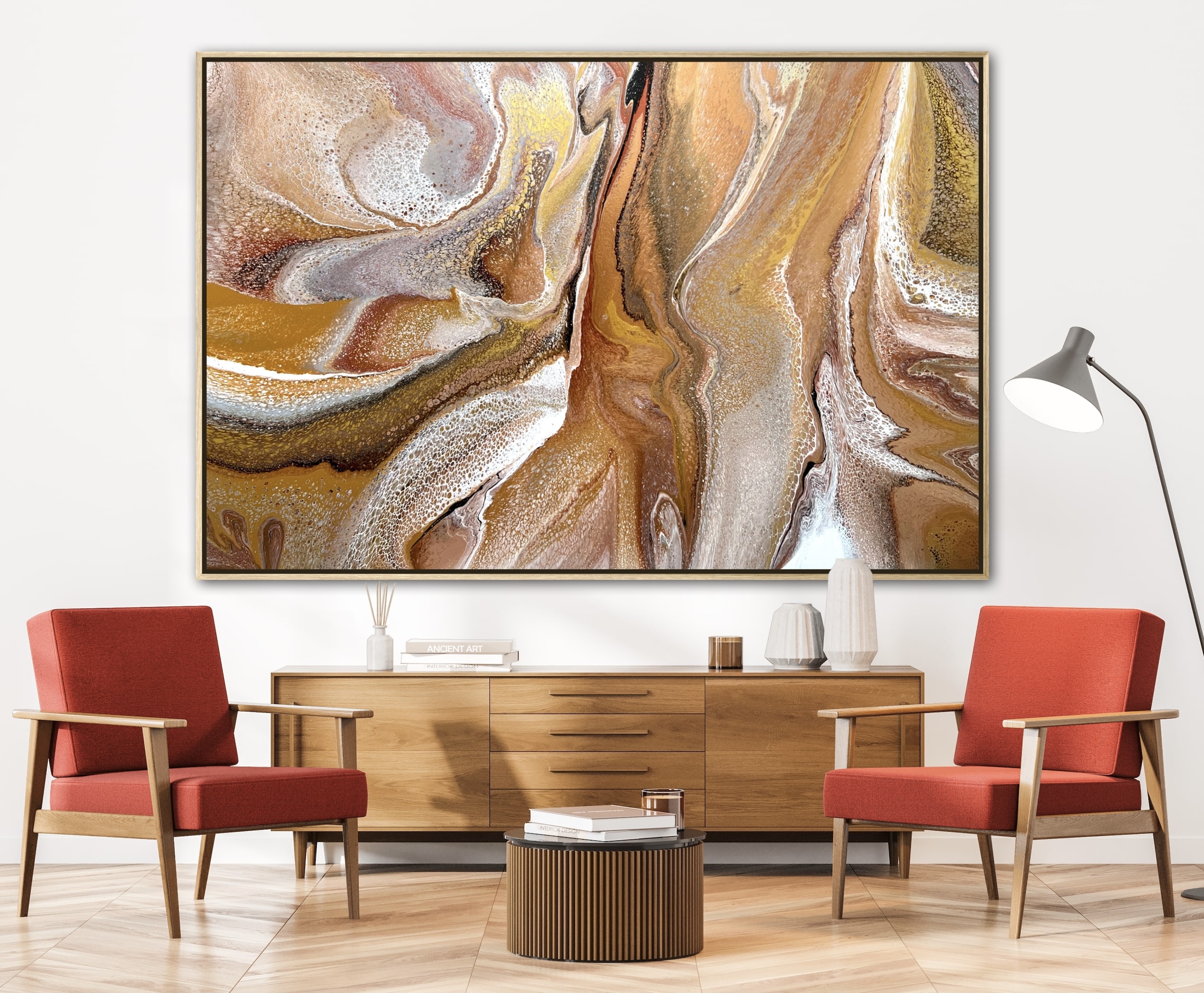 Colliding Sands was created using various techniques combined to allow increased flow, interaction and separation of colours to create interesting patterns where pops of colour can be seen emerging from underneath. This added dimension adds lace and cells to the artwork creating an interesting and one of a kind painting that can never be replicated. A gorgeous variety acrylic pigments were used including metallic yellow and warm gold, cream, brown, bronze, silver, grey, black, rose gold and white.