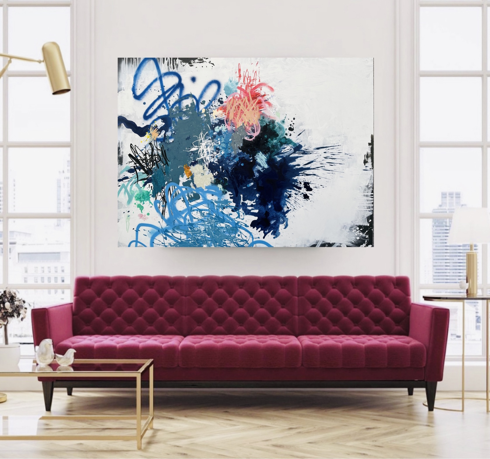 The artwork is a Large Statement piece and will give maximum impact to any room. My art is directly influenced by Graffiti in City Laneways, Vintage Billboards and other weathered surfaces. This piece is also inspired by my love of gestural abstraction and my obsession with using spray paint.