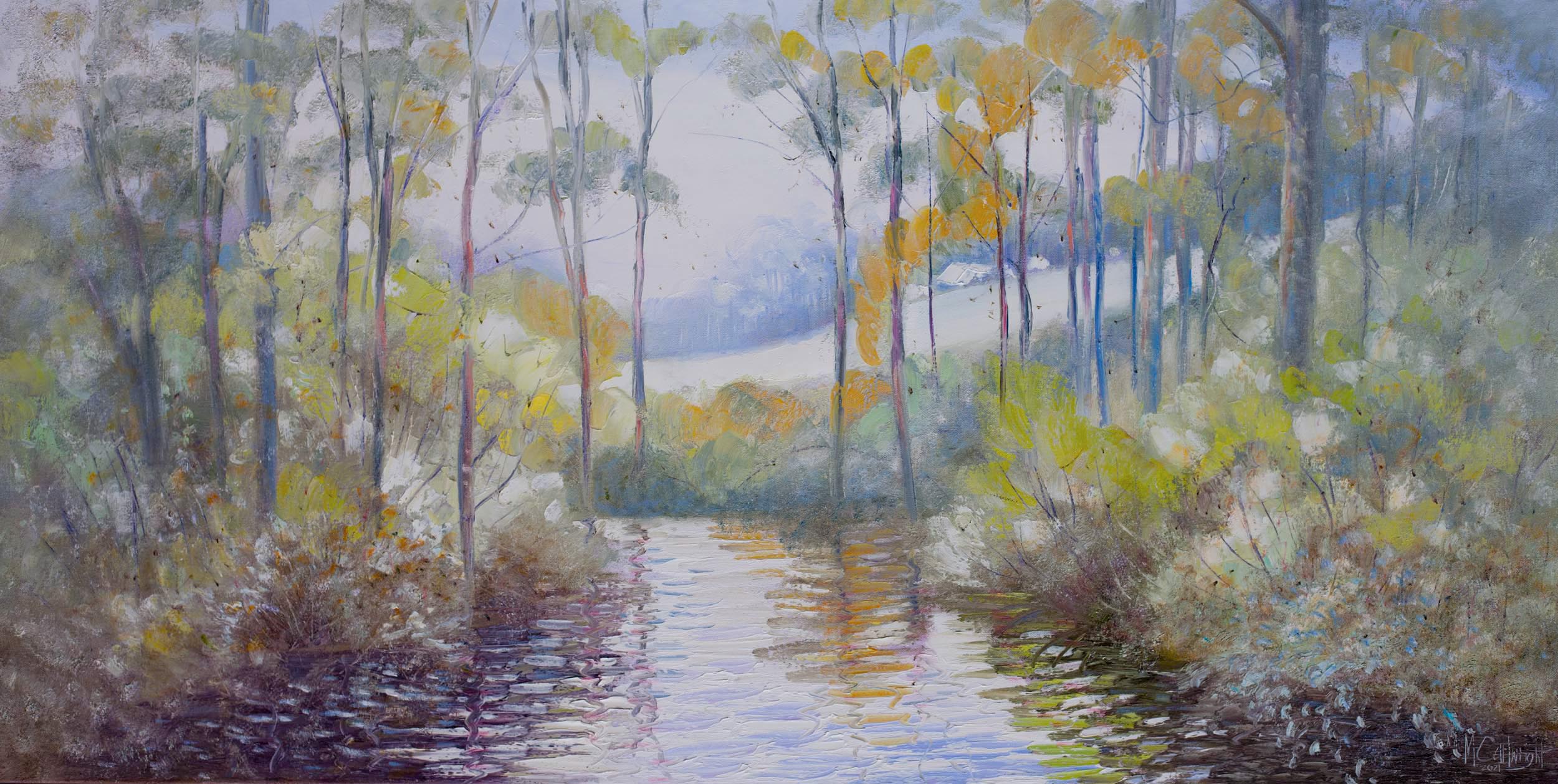A slow moving river meanders through a forest of red gums and karri trees. I was inspired by the colors along the riverbank and their beautiful reflections in the water below. The location is South Western Australia. A textured oil painting, spontaneously rendered using a palette knife.