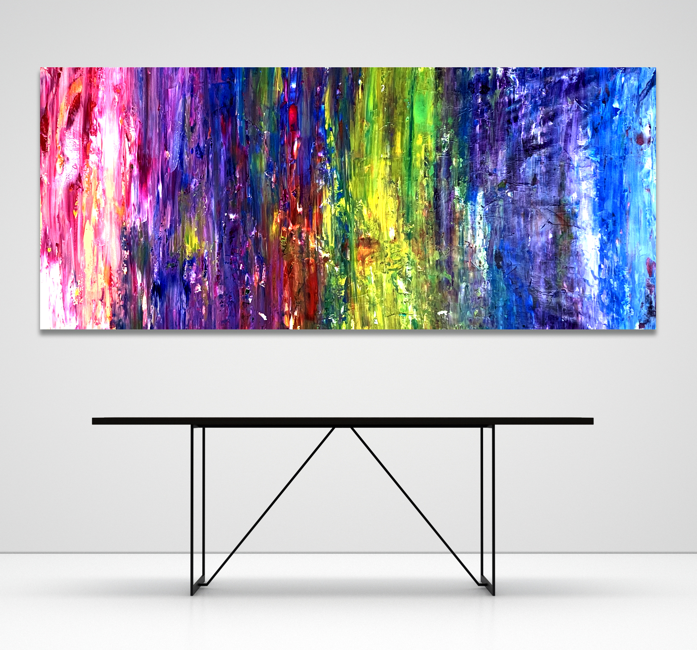 Each canvas is 85 cm (H) x 200 cm (W). The sides are painted in the same manner so no frame is required. The painting was created with Synthetic Polymer on a professional stretcher.