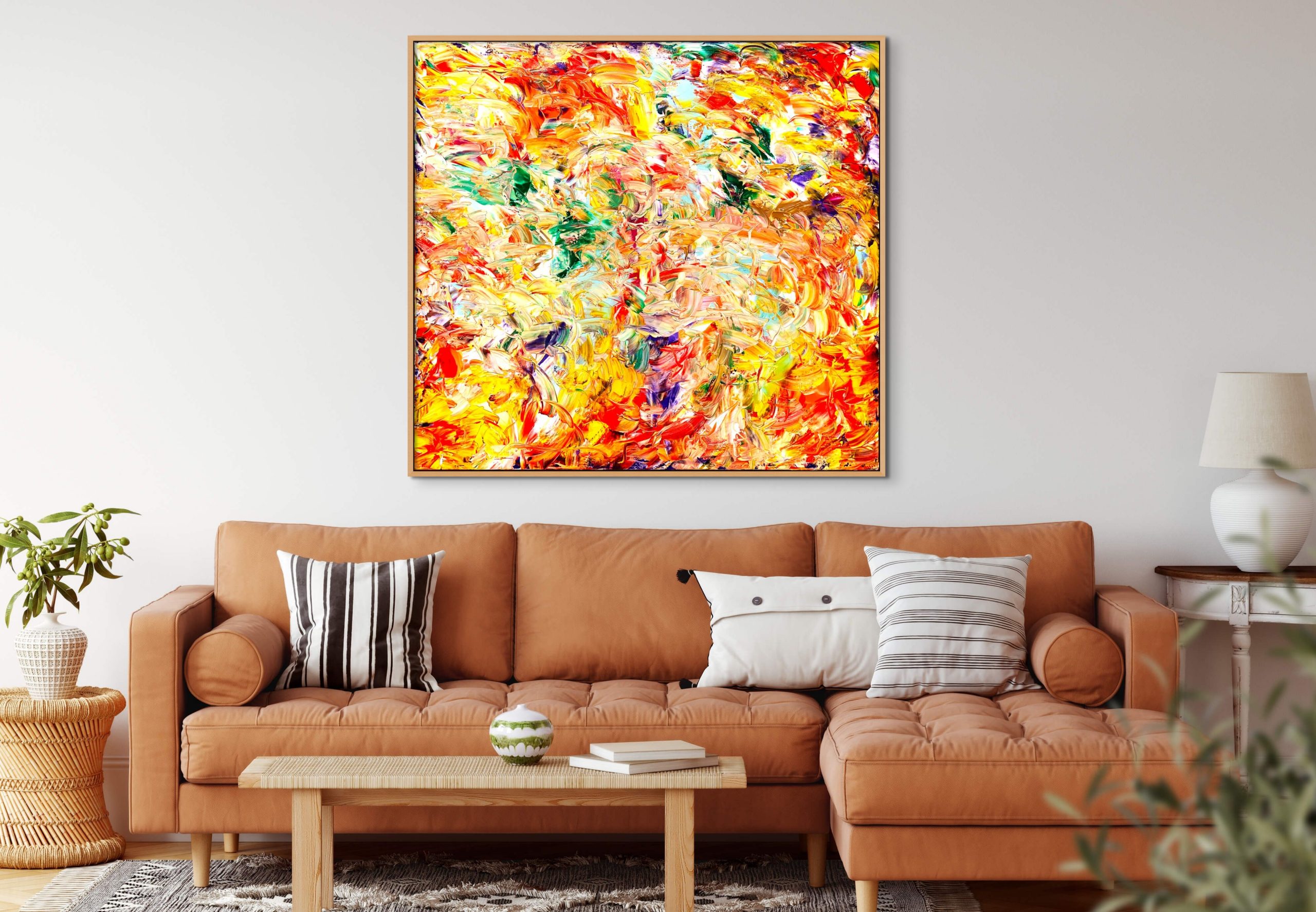 This work is painted on professional-grade Italian linen and has been sealed with varnish. The canvas has the dimensions is 130 cm in width by 120 cm in height. The sides are painted painted purple, the same purple in the painting, so there is no need for a frame.