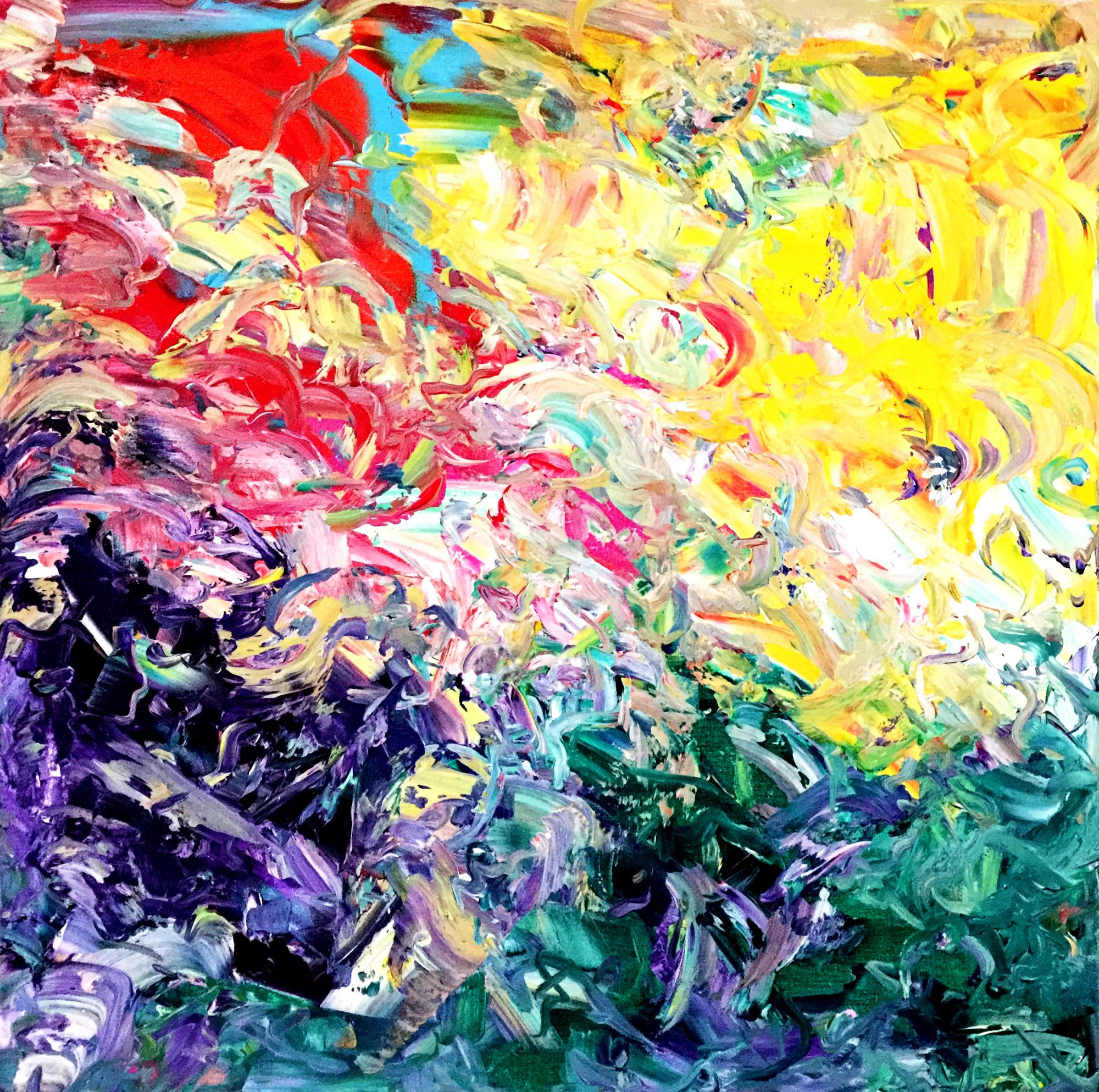 This work was inspired by the emotions in dreams. I dreamt of vivid colour and it produced a very pleasant feeling, but when waking I could only remember the colours and not the dream.. It was a great feeling, while the idea behind the painting, was merely the act of painting – in the true abstract expressionist form.