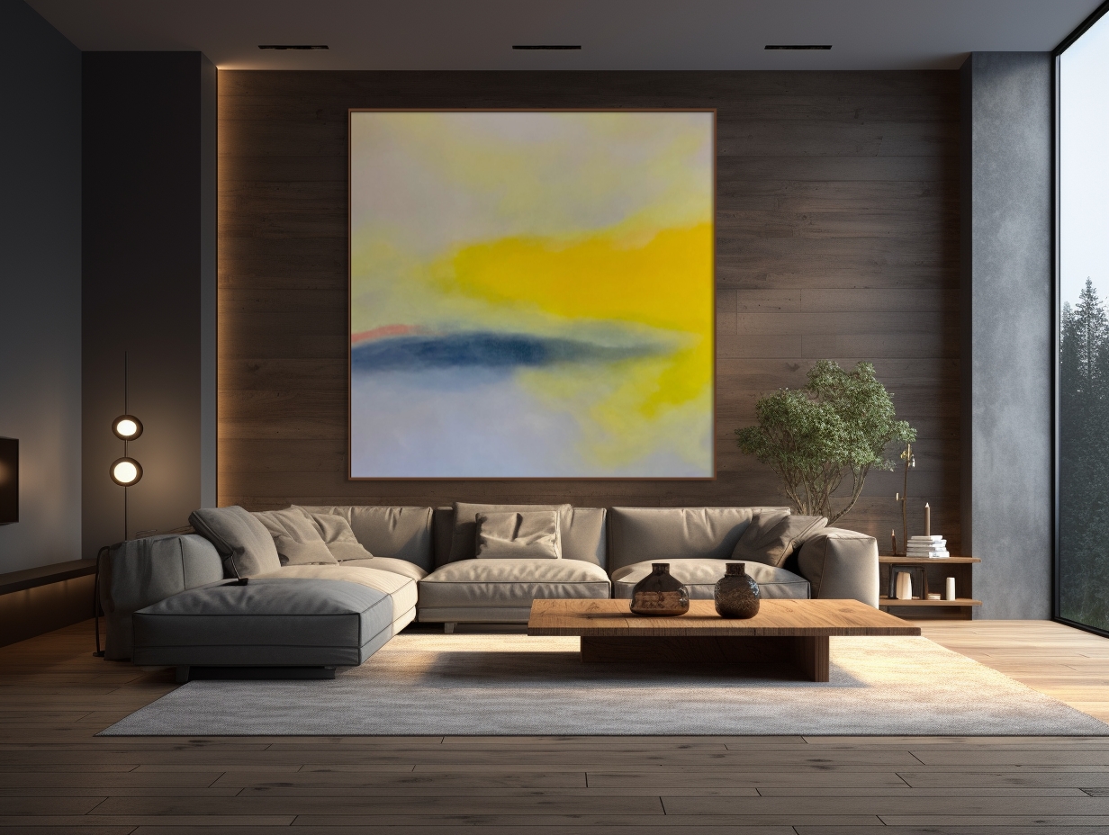 Colour Field 18 by Prue Crome –  is a large abstract oil painting, suggestive  horizon and sky. Cadmium yellow bring sun and light to the fore.