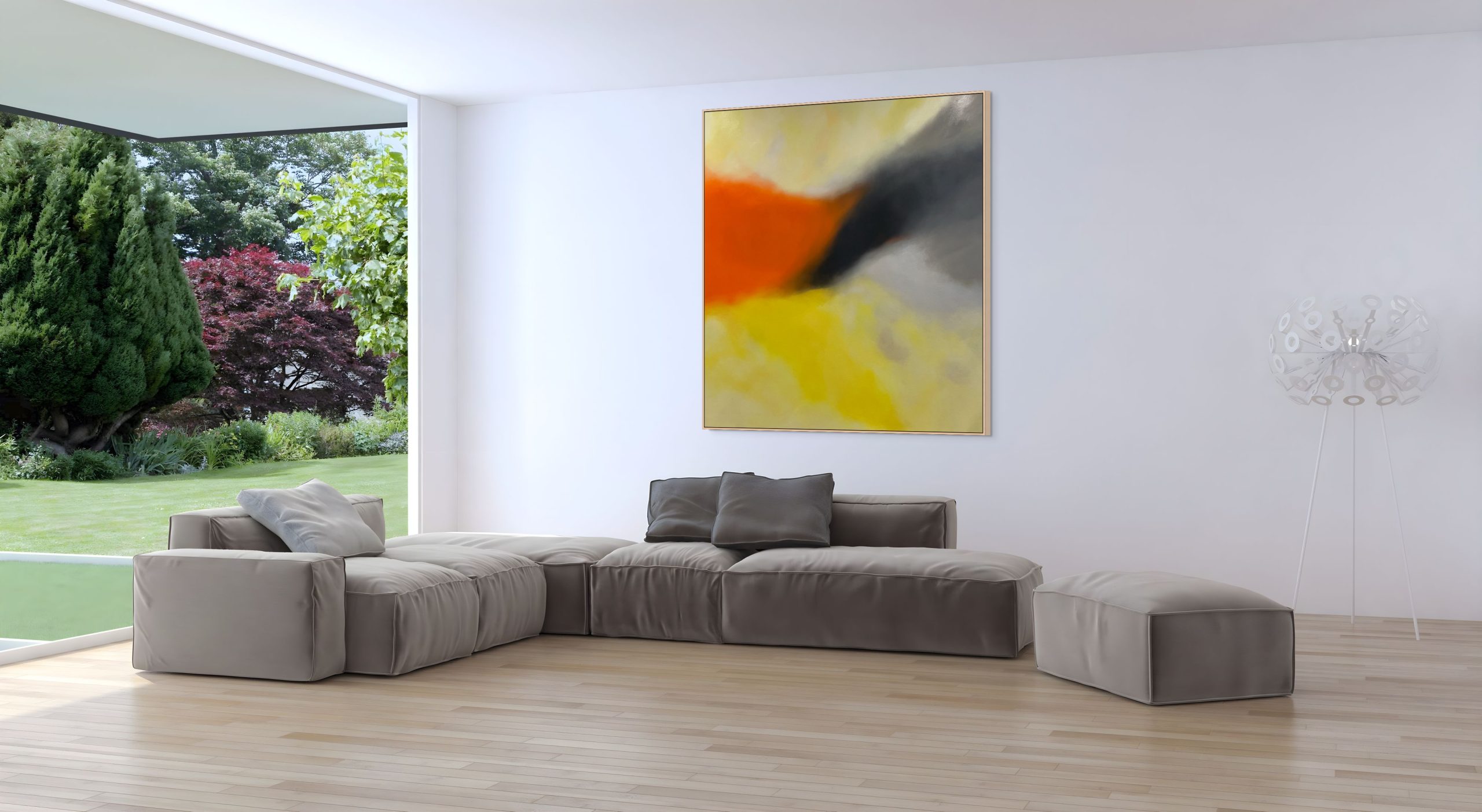 Colour Field 20 by Prue Crome –  is a large abstract oil painting, a bold work with the flow of orange interrupted by the charcoal. The silver element draws the focus from the centre into the peripheral paler colours.