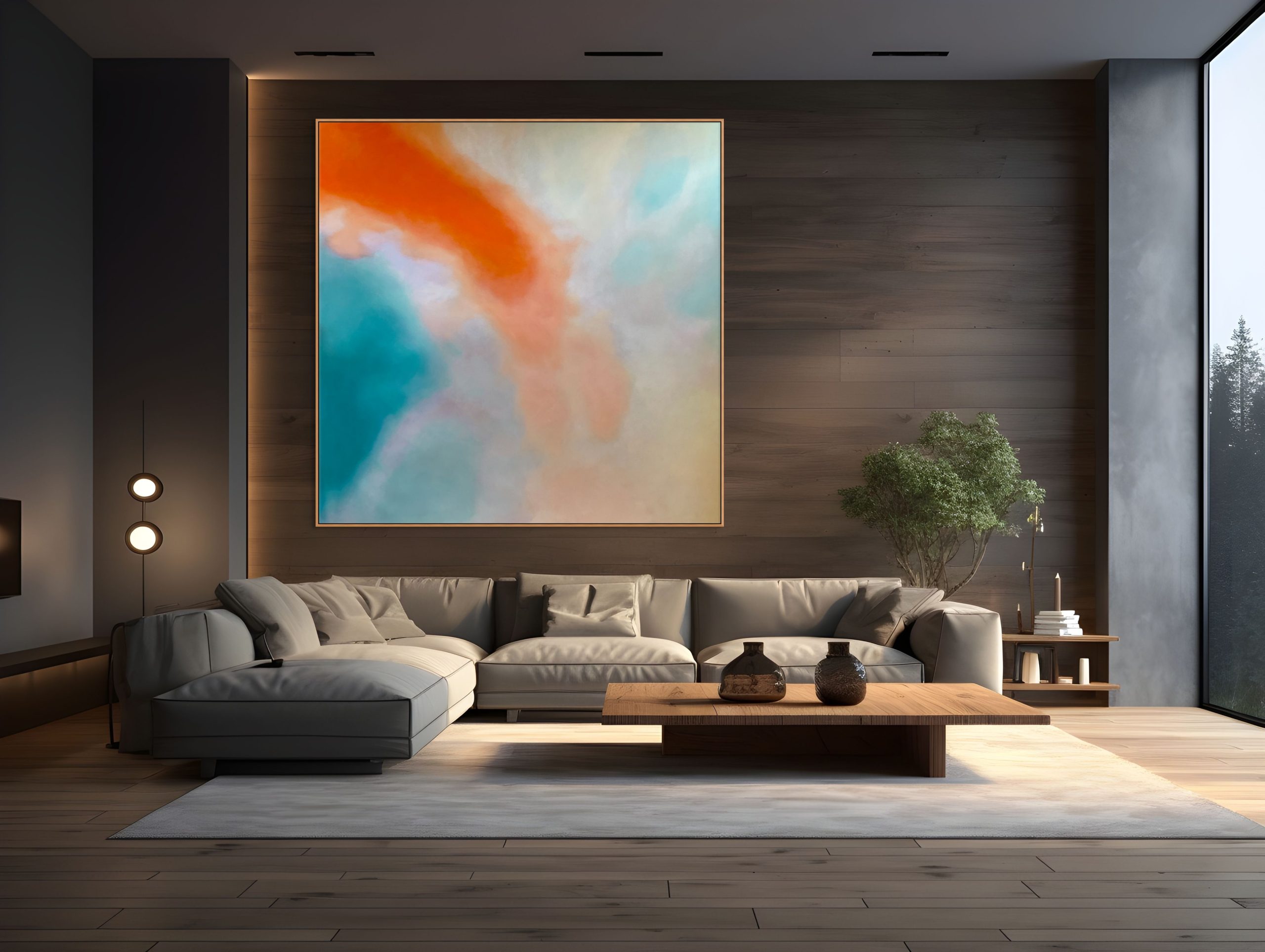 Colour Field 24 by Prue Crome – Â is a large abstract oil painting, which is a subtle work with a cool feeling despite the warmer orange floating through. It is difficult to capture the white and silver elements as this image appears somewhat beige. The silver floats under certain lighting.