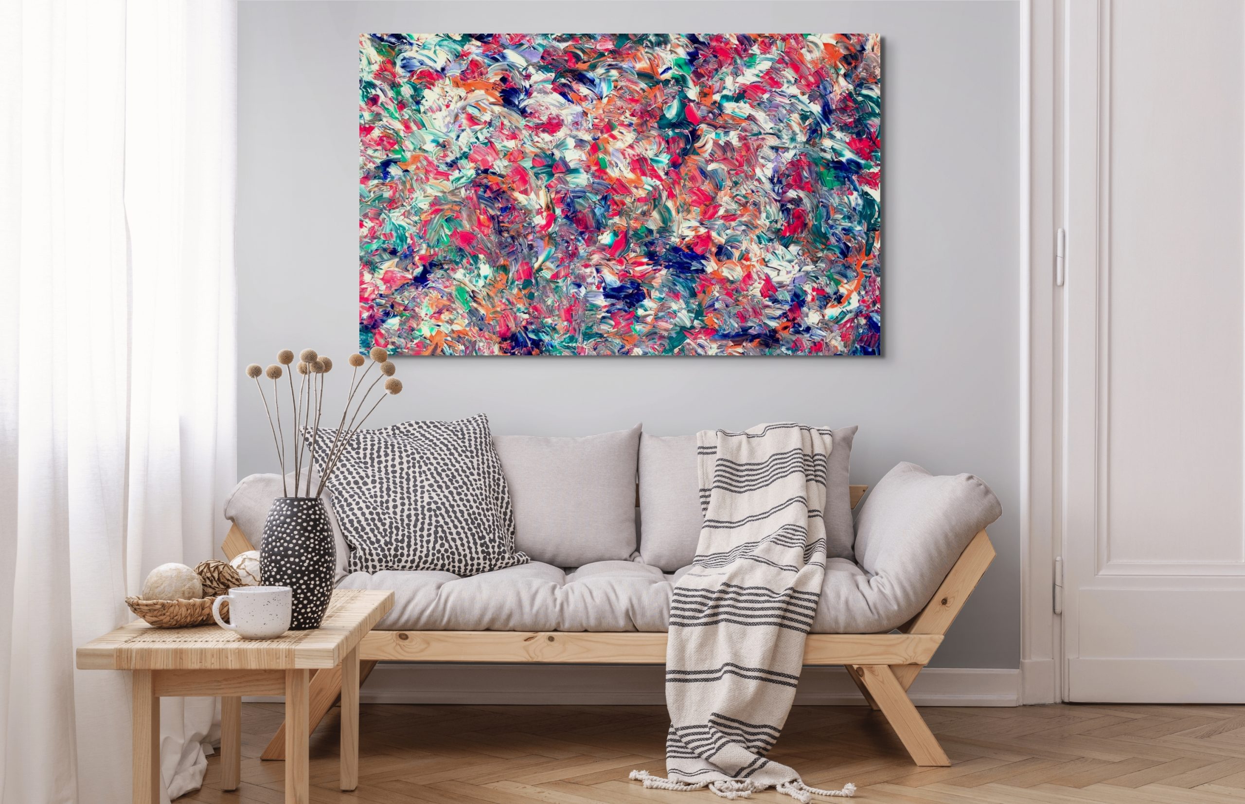 This artwork is painted on professional-grade canvas stretched and sealed with varnish. The canvas has dimensions 170 cm in width by 105 cm in height. The painting wraps around the sides of the stretcher, so the sides are painted in the same style as the surface. As such it does not need a frame.