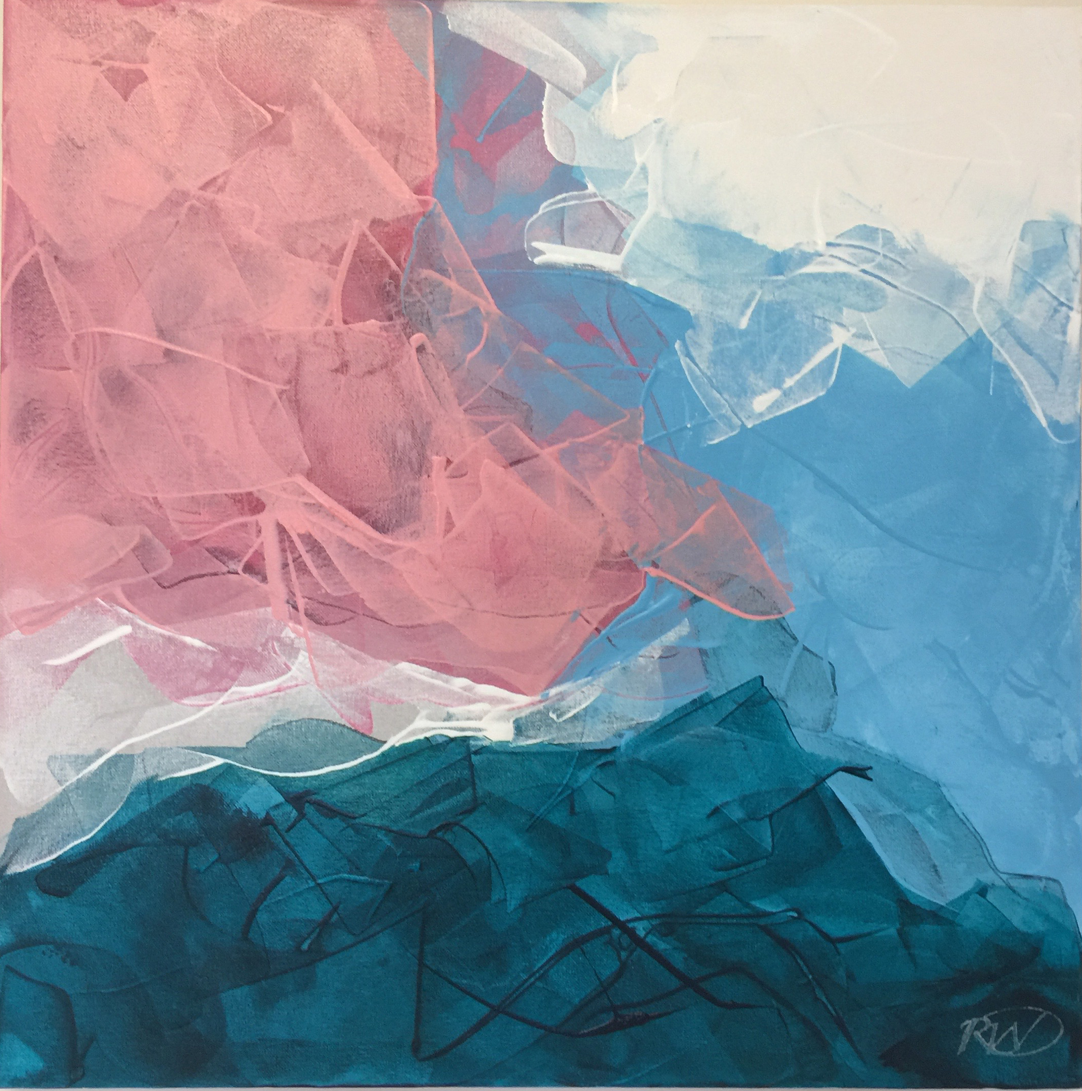 Colour Quake 3 – by Rebecca Warr – This is a painting where layers have been built up with the use of a Catalyst Wedge. More subdued pastel hues have been juxtaposed with dark emerald to create a sense of contrast. Movement has been achieved through the quick application of paint using the wedge and through the overlapping of hues. The building up of transparent layers of colour is something that gives this artwork particular aesthetic appeal.