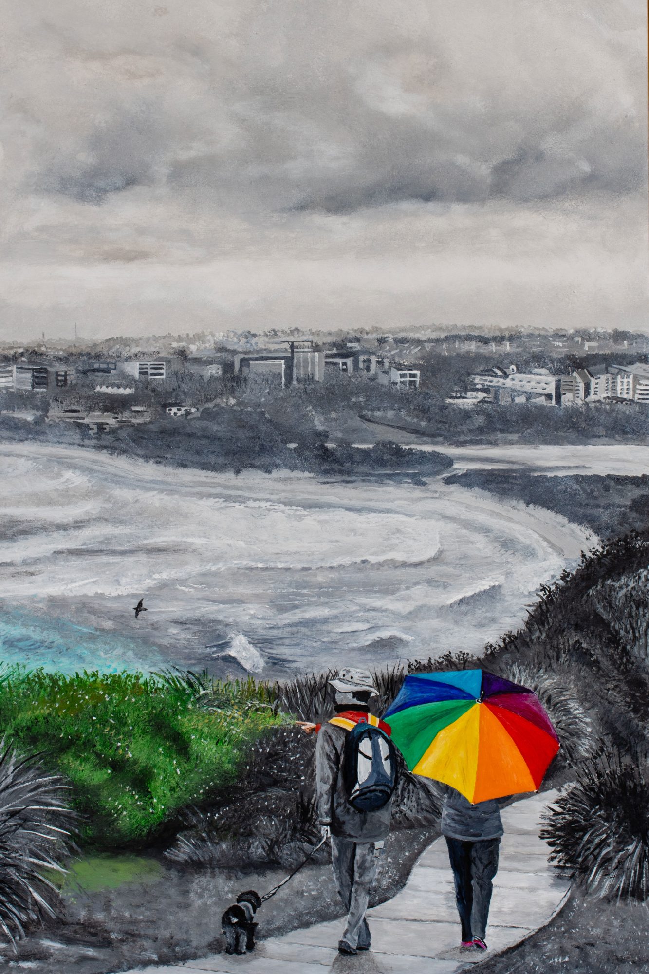It was on such a sun-stormy day, in July 2016, that I spoke with the couple featured in my painting. I think they said they had travelled from the New England region of NSW to dog sit for friends in Collaroy. As we said goodbye a fresh rain squall moved over us and up went their bright umbrella. I asked if it would be ok if I pictured them walking away towards Dee Why and they happily obliged.