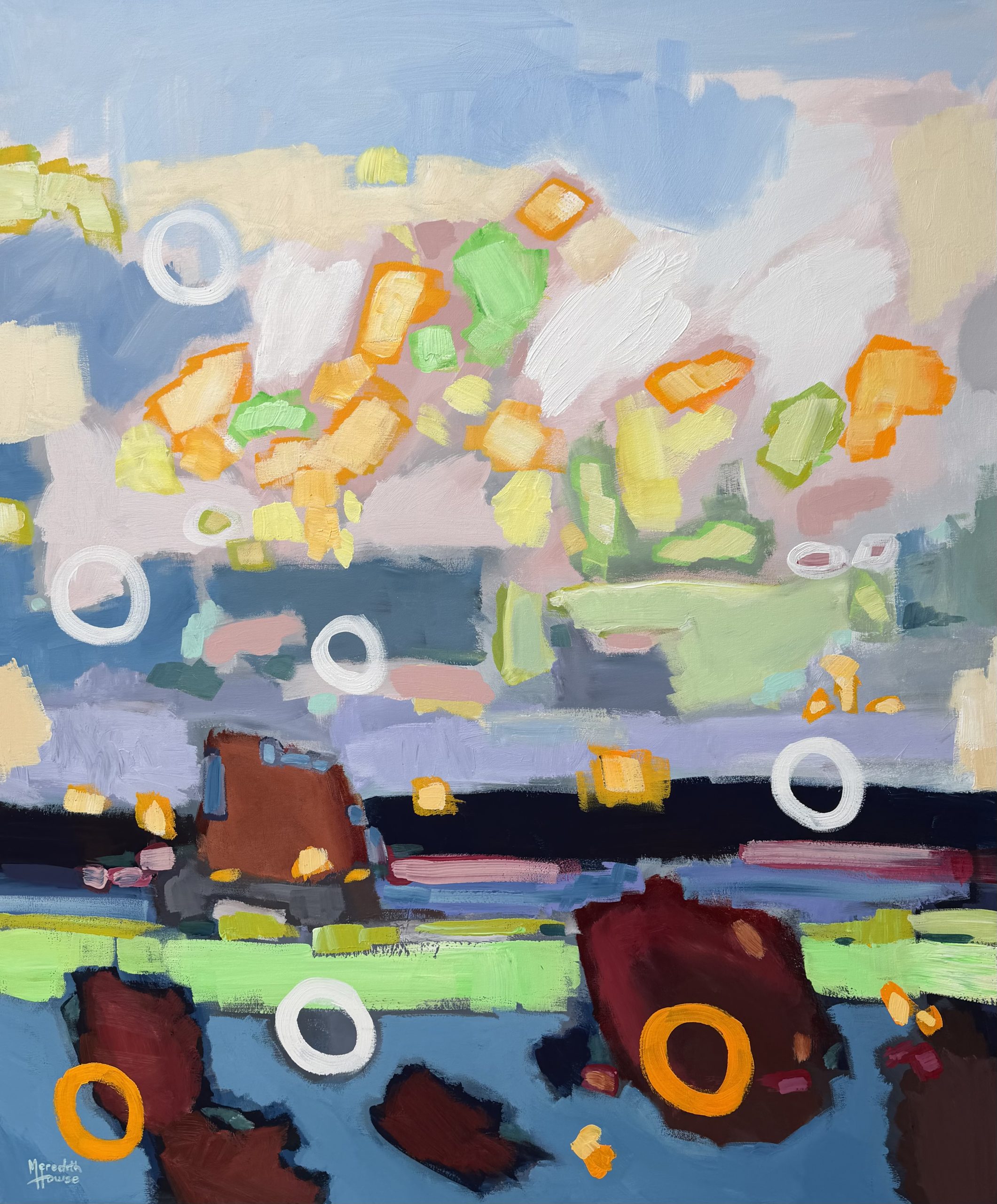 The artist’s expressionistic approach results in a dynamic piece full of visual interest. The use of acrylics on canvas allows for rich, saturated colours and textures, drawing the viewer in. The circular forms hint at a sense of wholeness.