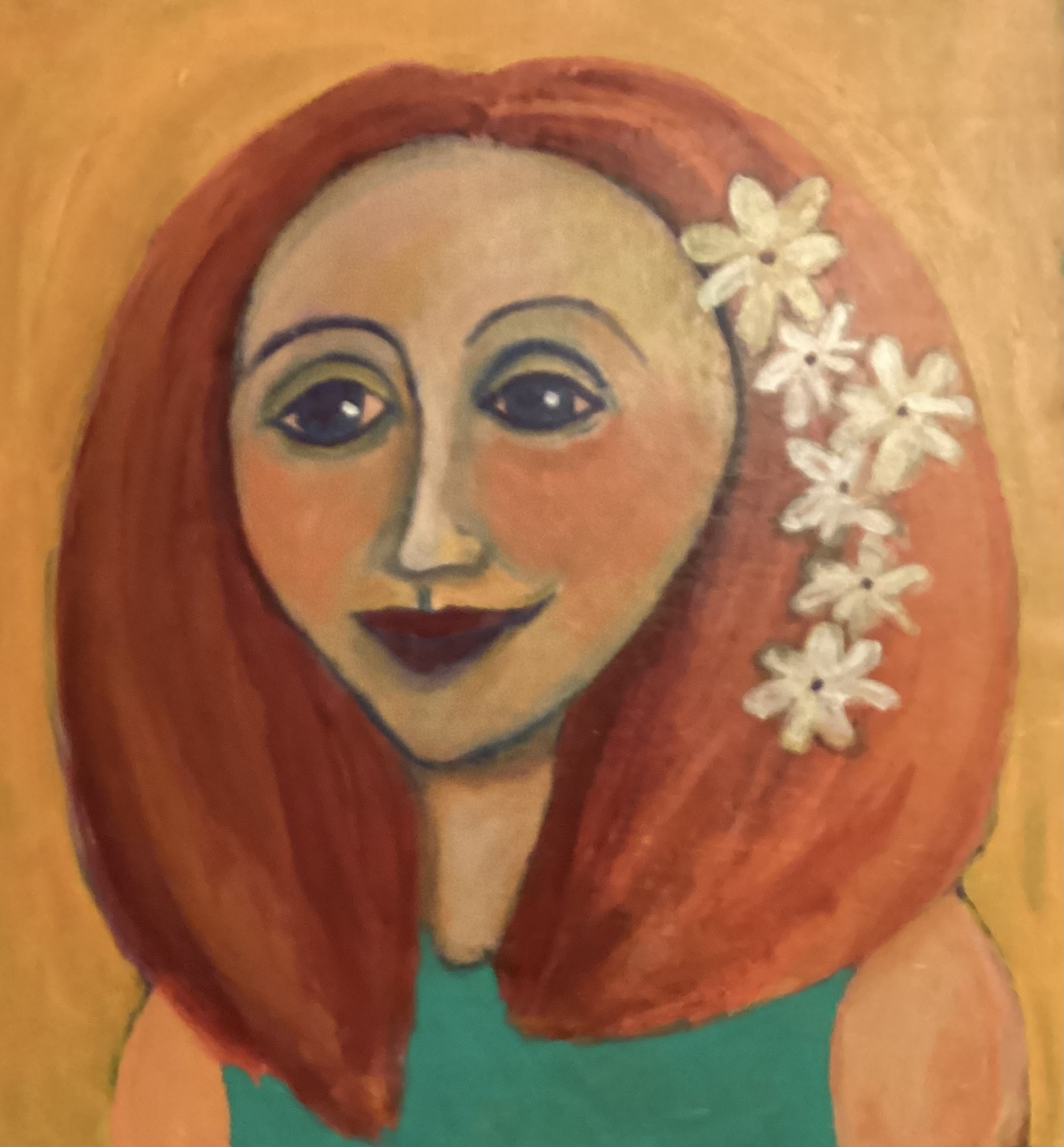 Colourful Cate by Margaret Connell – Acrylic painting on primed Italian linen sealed with satin liquitex Not framed 35 cm wide x40 cm high but canvas larger for framing purpose.It is an original work .It was inspired by memories of a past acquaintance who had vibrant aurban hair, from my live of colours and for creating faces