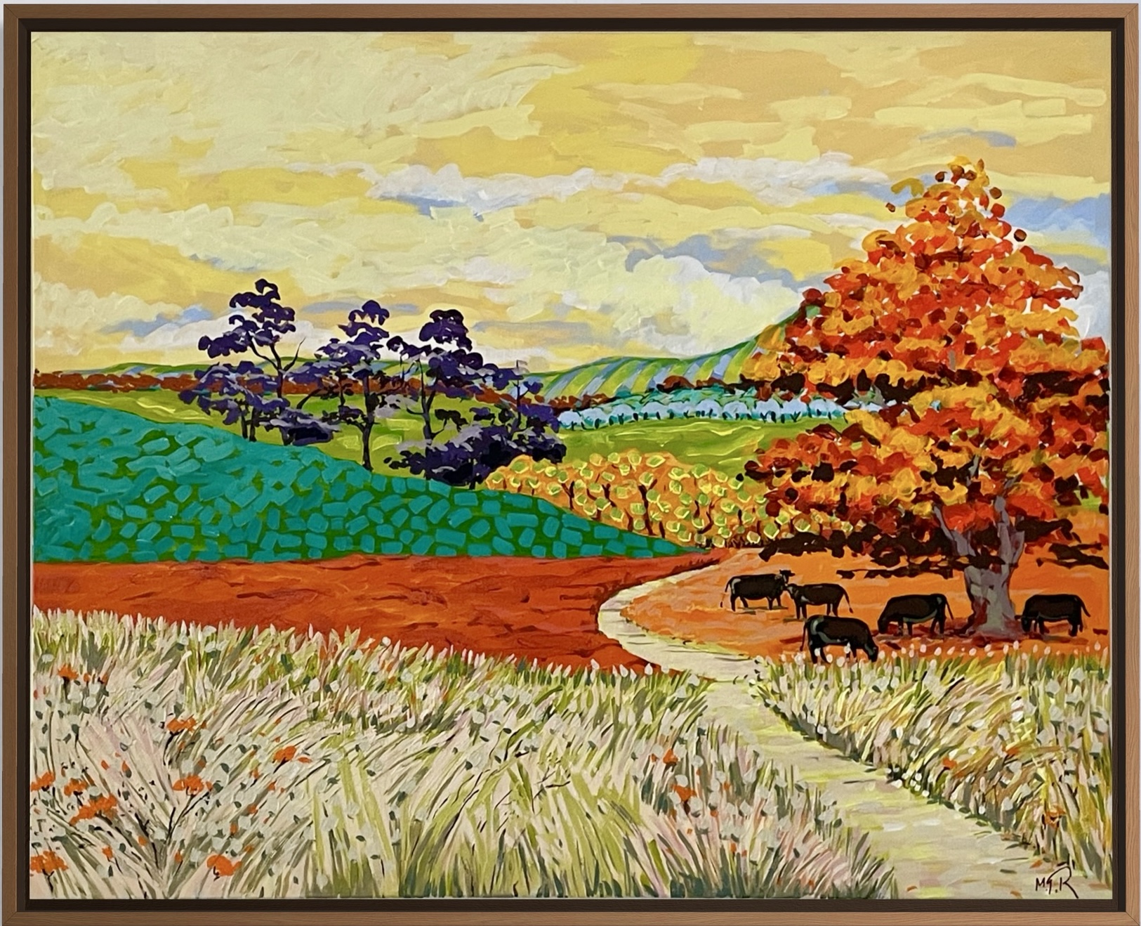A vibrant painting depicting grazing cows in a colourful landscape. Layers of thick acrylic paint have been applied on a stretched canvas. This work comes with a floating frame made from recycled timber. It is ready to hang and enjoy.