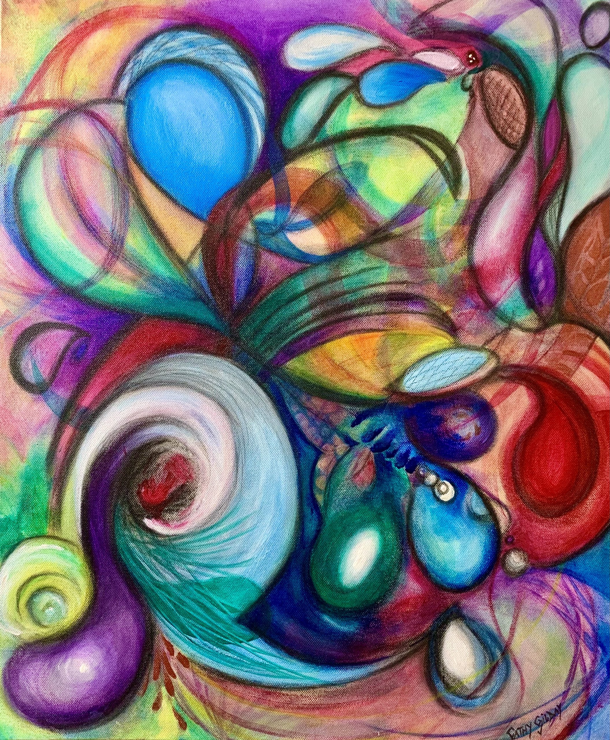 A colourful abstract painting with a rhythmical movement. In this piece‚ I was attempting to mimic sound‚ visually. Acrylic Paint and sealed charcoal on stretched canvas, sides painted and ready to hang.