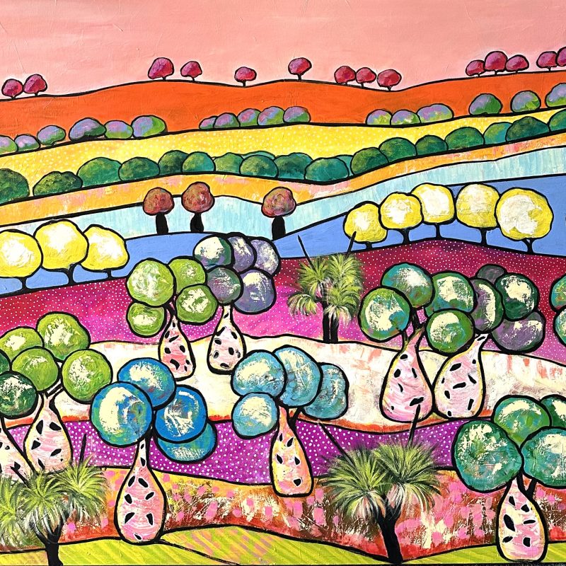 Colours of Dreams by Theo Papathomas a painting celebrating colours of the Australian landscape. A very soothing and tranquil painting with lots of movement and rhythms to create this beautiful harmonious landscape making it a very contemporary abstract painting of the Australian landscape. Capturing the beautiful colours of the landscape that brings it to life .