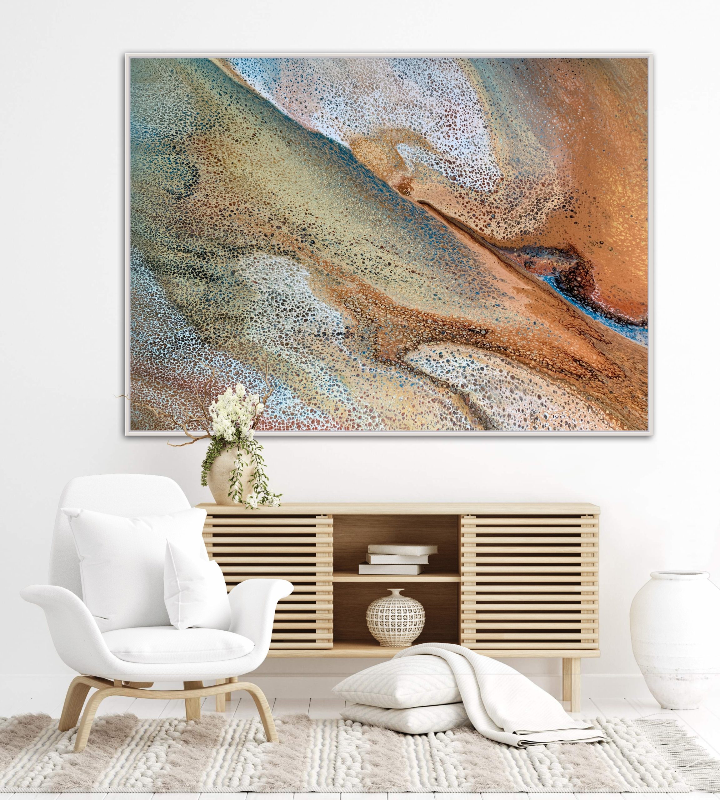 ‘In situ’ photos have been included to help with visualisation of the artwork in your home. In situ photos provided were created using the ArtStage app and may not be perfectly to scale. This being said, every effort has been made to represent the size of the art accurately but please read the dimensions of the artwork to ensure it fits your space perfectly. Where provided, photos of framed art are for illustrative purposes only.