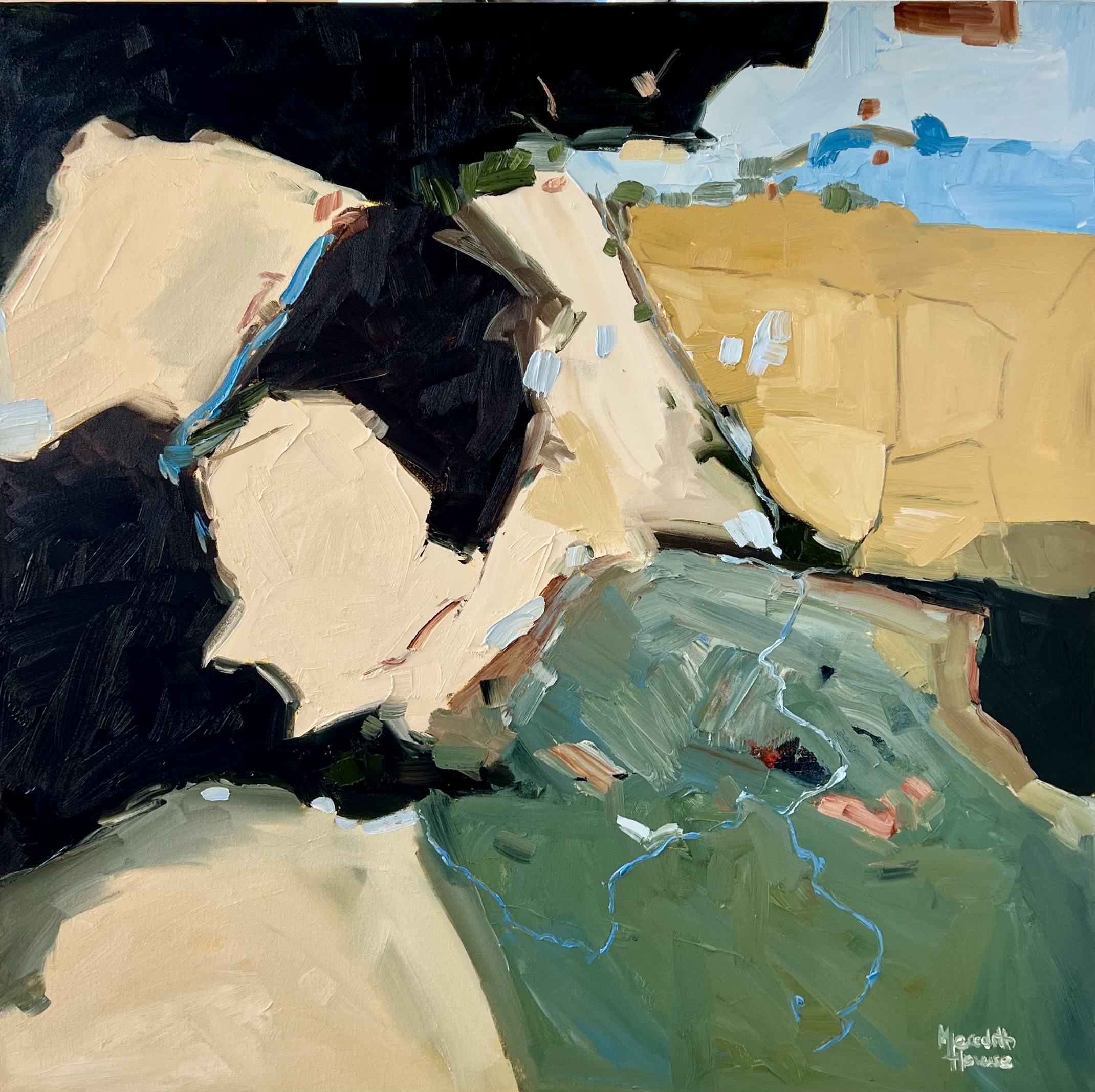 Colours of Texas 5 by Meredith Howse is an artwork on stretched canvas that draws inspiration from the earthy hues of the Australian countryside near Texas in Queensland. The Colours of Texas Series, as seen on The Block 2021 is a sophisticated collection of abstract landscapes showcasing harmonious blends of rich deep greens, earthy browns, and warm ochre tones, with a subtle splash of blue representing the meandering rivers, serene dams, and expansive blue skies. The artist employs a birds-eye view perspective, allowing viewers to immerse themselves in the texture and dynamic compositions of the pieces.