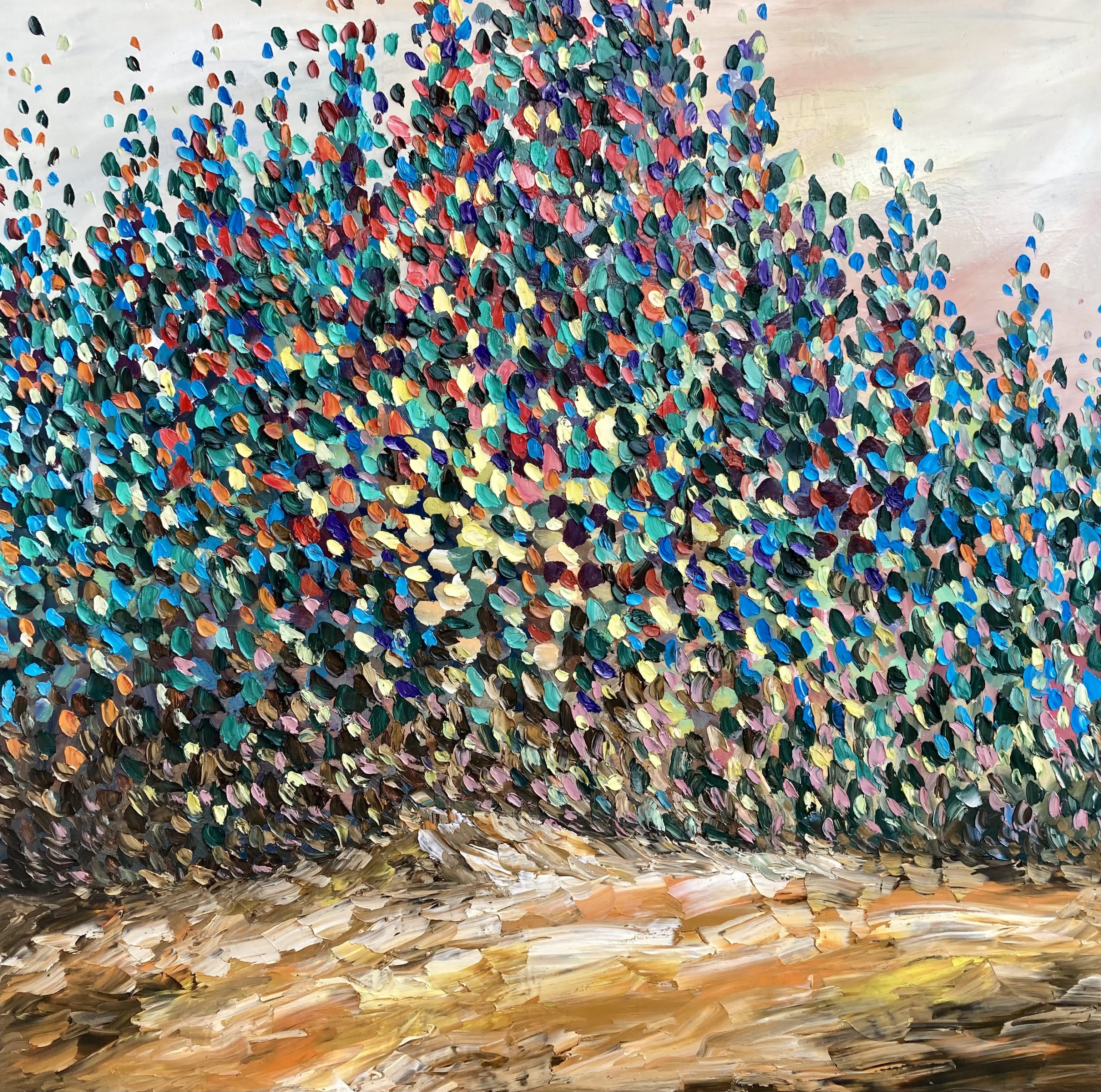 Colours of the Forest by Theo Papathomas –  a painting capturing the beautiful foliage of the trees and the colourful flowers. Warm and cool colours painted in thick oil paints with a pallet knife to capture the textures of the petals and flowers . The sky is painted in light colours and the foreground in beautiful ochre and earthy colours in thick layers of oil paint. Petals swept by the winds filing the sky creating this magical forest where you can lose your self and admiring its beauty. Hope this work makes the viewer feel very peaceful and tranquil. This painting is signed and dated 2021 at the back of the painting and comes with a certificate of Authenticity.