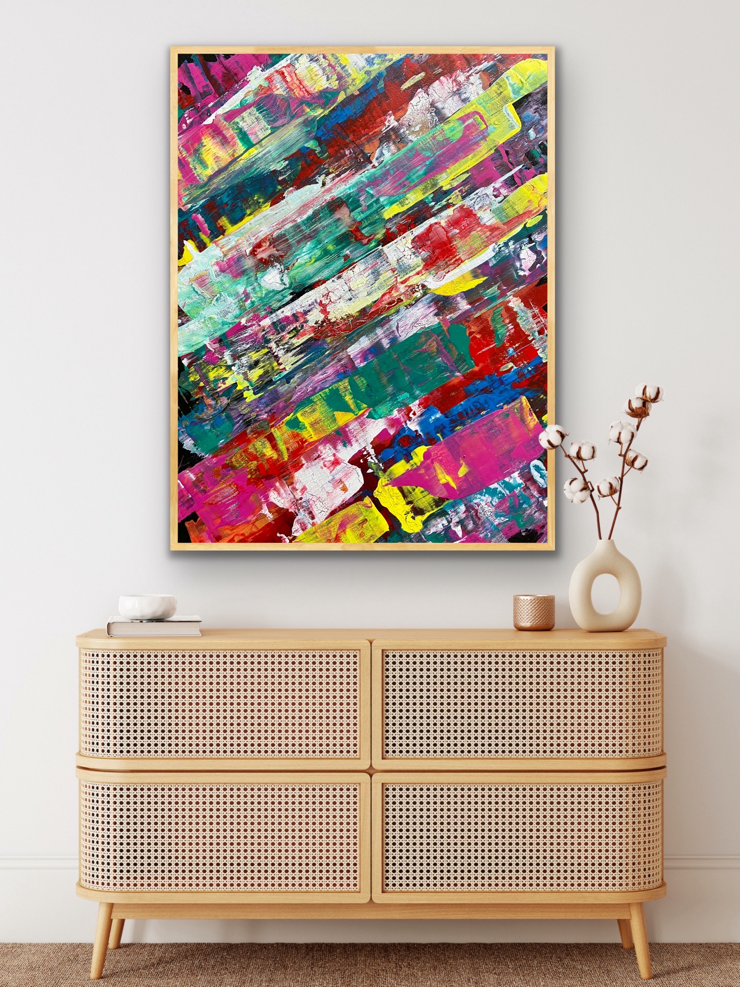 Please note, this artwork is stretched and ready to hang but not framed, framed photos are shown to give perspective of a framed setting.