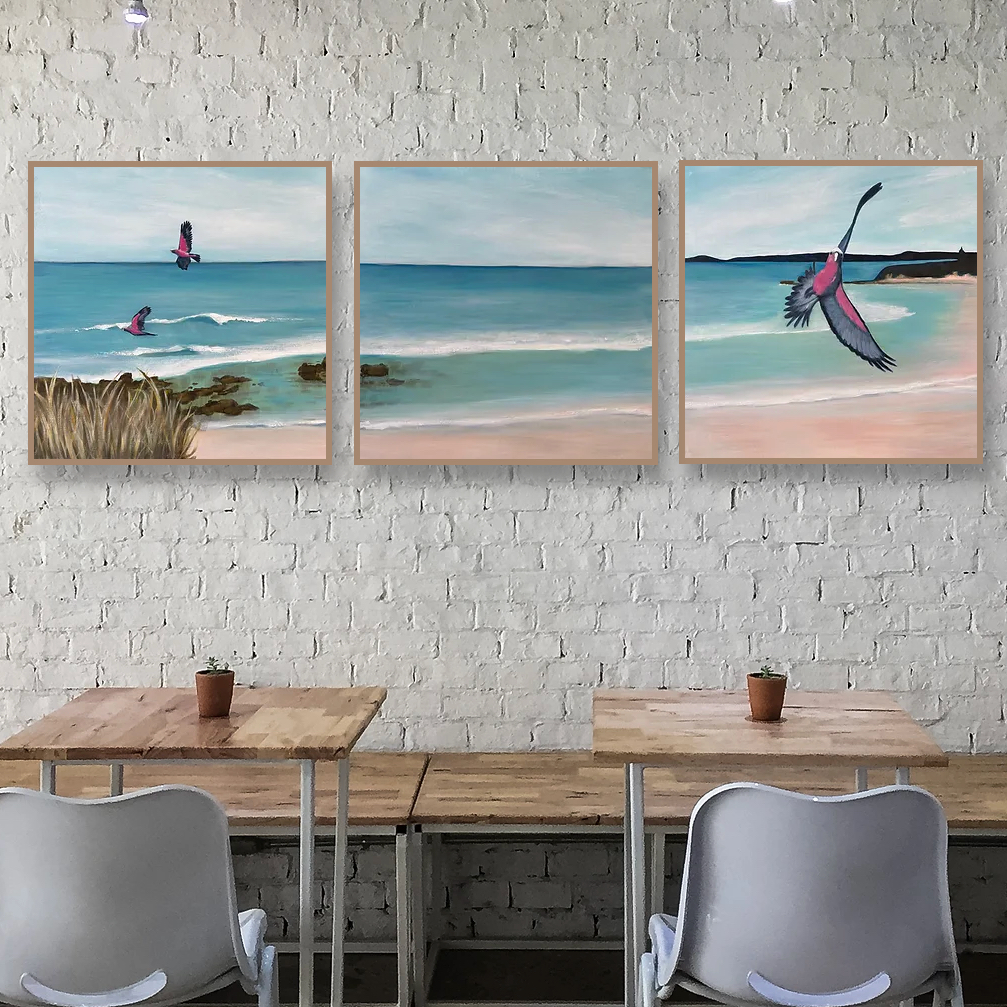 Swimming at the beach and soaking up the view is a big part of our summer experience. We may think that it’s just taking time off from work that makes us feel so refreshed, but consider that the act of soaking in water deeply purifies our psyches and makes us feel renewed. Soft blue is a colour relating to the sky and ocean which promotes the feeling of tranquility and healing. Soft pink hues expresses romance. This triptych of 3 canvases depicts being in the moment, being mindful and connecting with others with colours of love and refreshment. What a wonderful intention for your life and home. A beautiful statement in any room of the house, remembering that water is not encouraged in the bedroom.