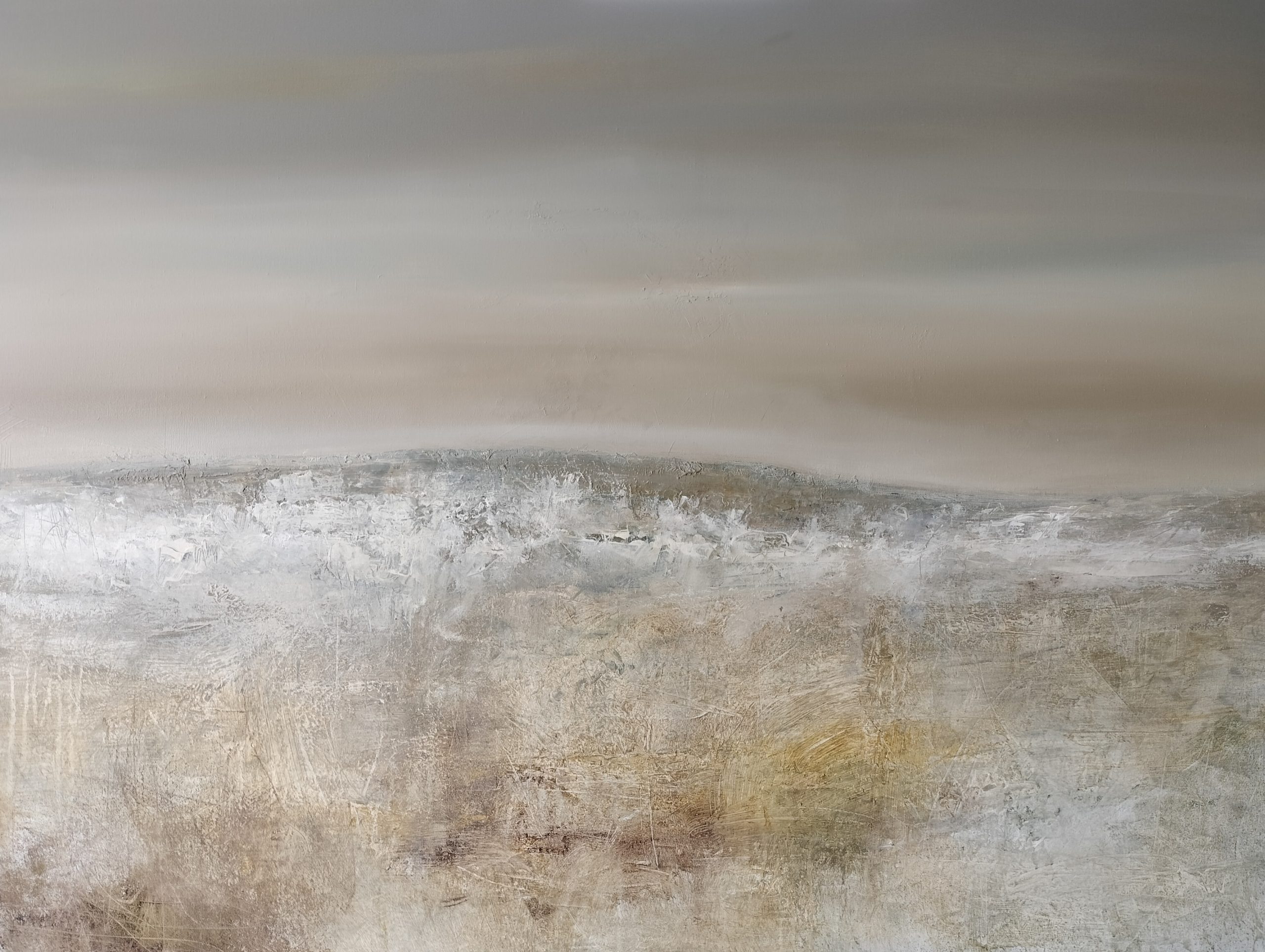 ‘Comfortably Numb’ depicts a serene hillside bathed in muted, neutral tones, where the textured strokes evoke a sense of stillness and isolation. There is a subtle interplay of light and shadow throughout the painting in both land and sky. The painting’s passive, almost neutral palette—grays, beiges, soft browns and whites—imbues the scene with an atmosphere of introspective detachment.