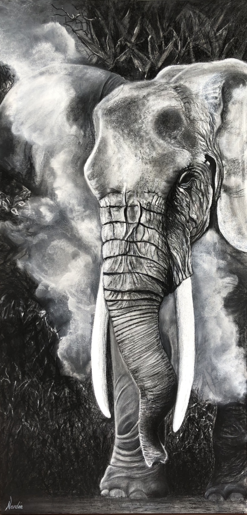 Elephants are such huge gentle giants. Using black and white charcoal on a large stretched canvas seemed the best choice of medium to bring him to life emerging from the dust and thicket.