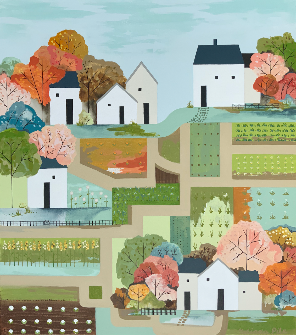 Community Garden is the next original artwork by Melinda Pile. Melinda is constantly inspired by the natural world, beautiful garden views, Â insect and bird life and abundant trees and flowers. In addition to the natural world, Melinda is fascinated by how communities work together and interact. This painting is inspired by the colour and flamboyance you can see in community gardens and allotments. The little pathways and planting schemes are all unique. This painting is framed – it has a floating Blackwood stained frame.