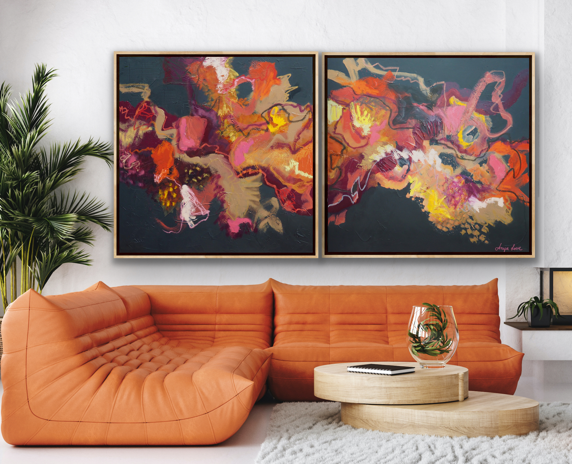 Original artwork. Oil paint & oil sticks on stretched canvas with gallery quality wire hanger. Diptych 81cm x 162cm together.