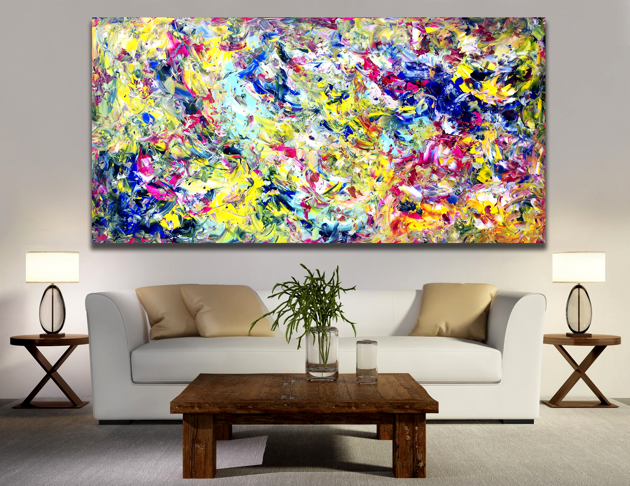 Complimentary Angels by Estelle Asmodelle – This painting is an emotional expression of feeling protected. I feel a sense of protection around me, and during this pandemic, it is a great feeling to have. I would not take risks nor put myself in harm’s way but I just feel that all will be well. This work is painted in the style of abstract expressionism. The canvas is 183cm (W) x 91cm (H) x 5cm (D).