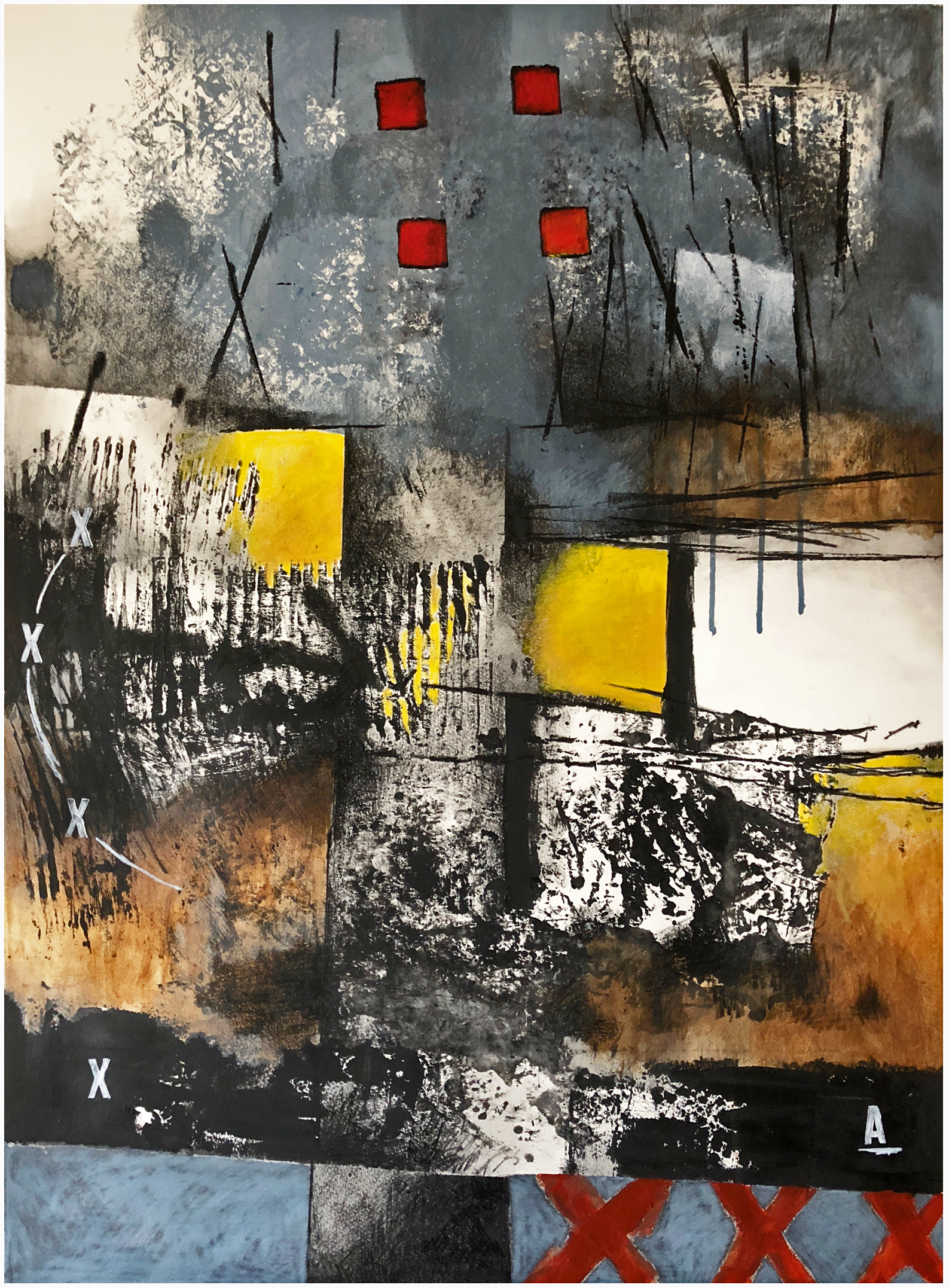 Composition No. 166 [ Four Red Squares ] is an original mixed media artwork on 300 gsm Saunders Waterford paper 56 cm x 76 cm. It involves using oil sticks, pencils [various types & layering], inks, paints, stencils and hand formed stencils that are hand printed. This work references the movement of internal shifts that allow to head to the four red squares as they are the desires that are within.
