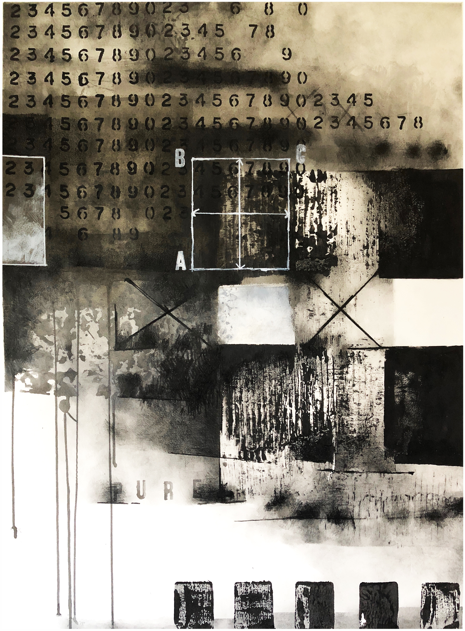 Composition No. 181 Pure is an original mixed media artwork on paper. It involves pencil [various & layered], inks, paint, stencils, printing techniques and hand made forms that are relief printed. Composition No. 181 Pure is referencing that pure emotion that can ignore all the facts and figures that might not add up and doing what is pleasing to oneself. Finding that pure joy feeling from within. This piece explores the attempt to find emotion with the use of black and white only. Colour would only distract from this piece.