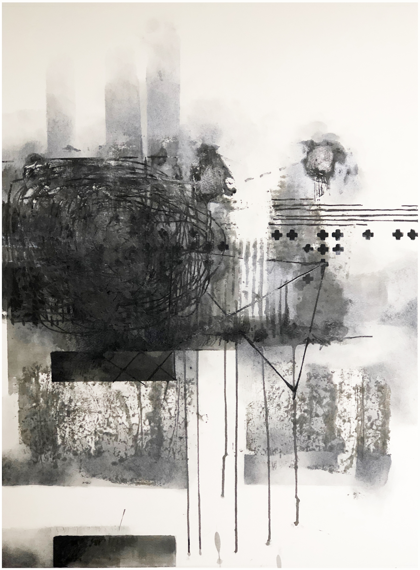 Composition No. 226 [ Black with Greys ] is an original artwork that is about revealing the conscious and sub-conscious worlds from using formal patterns, hand relief printing, stencil making that form our 3D outer world we survive within. To the gestures of mark making, ink work with transfers of blocks of greys that represent the emotional internal world. This represents the breaking of inner and outer barriers to move to the unknown future.