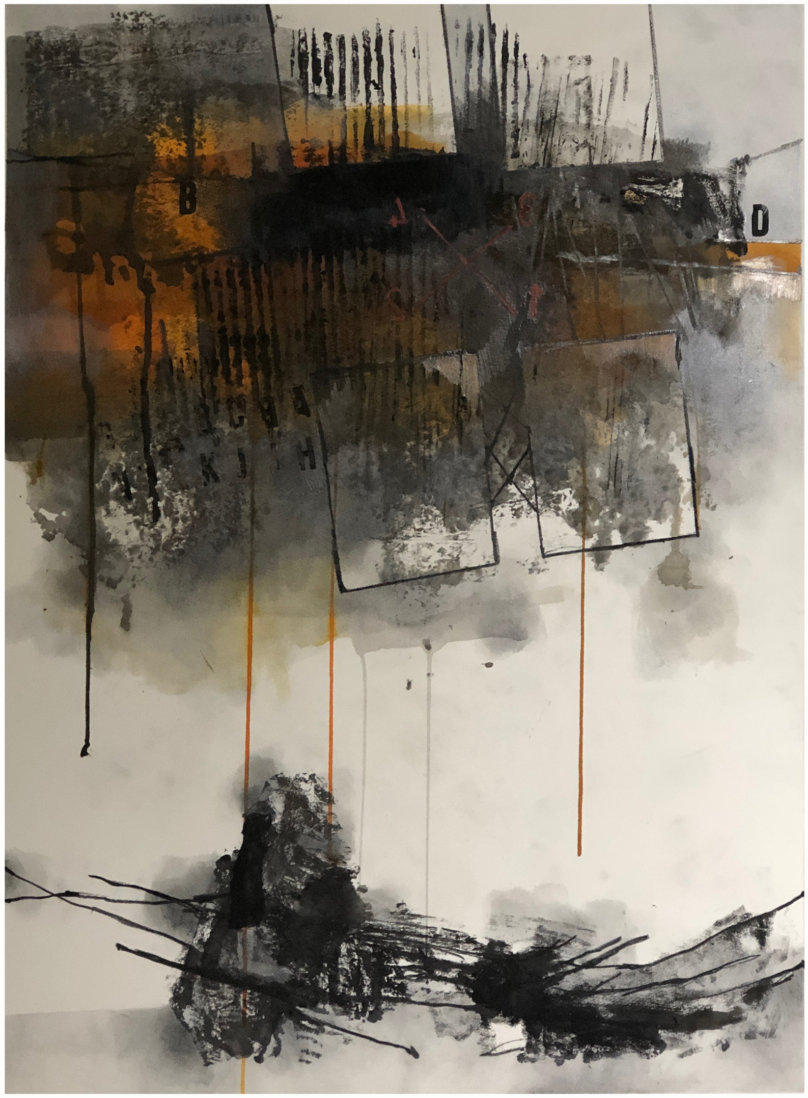 This a mixed media original artwork with the use of hand printing from hand formed stencils, stencils, stamps, paint, inks oil sticks and various pencils to complete this piece which is on Saunders Waterford 300 gsm paper.