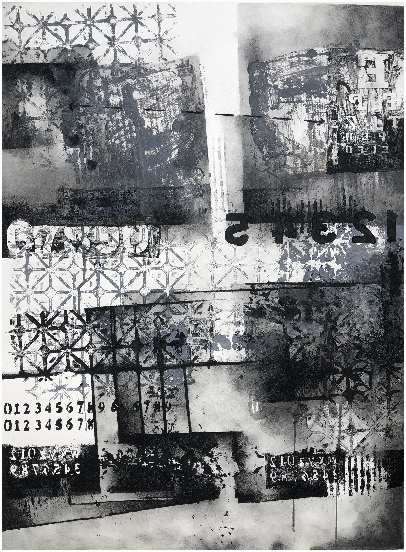 The work references the breaking of patterns within time to change the surroundings, thoughts and feelings. Trying to establish thoughts and feelings onto paper with a limited pallet and contrast. The use of stencils and hand made forms add to the printing elements with a mix of various pencils, inks, paints and oil sticks that finish the work off.