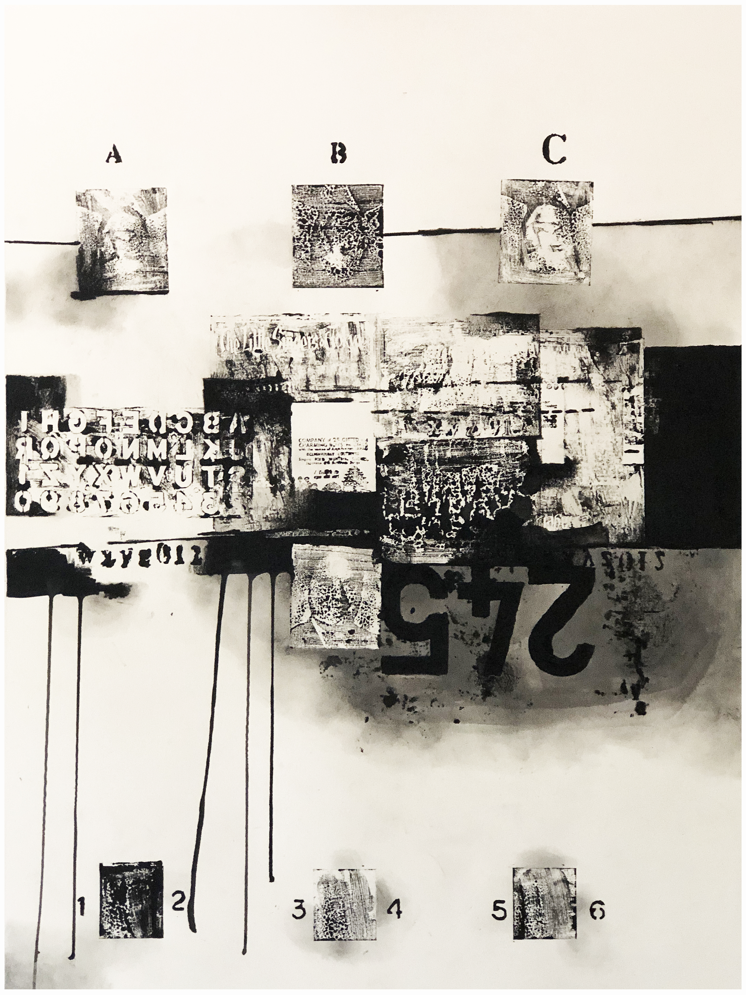 With the use of vintage printing plates, hand made forms and stencils provided the basis of this work. Inks, paint and various pencils.