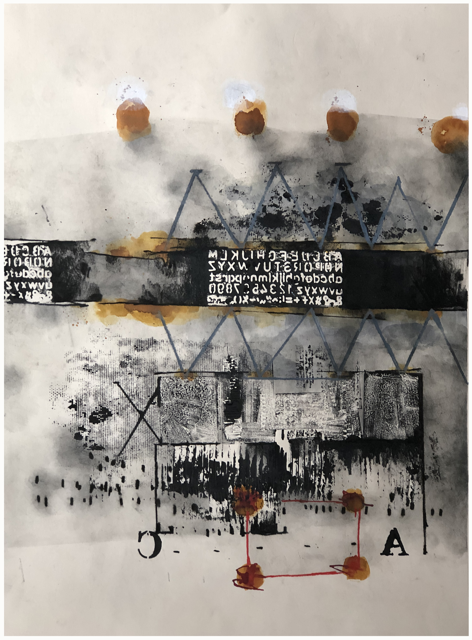 Composition No. 245 [ Backwards C ] is an original mixed media artwork on Lana [ creme paper] 220 gsm paper. It’s a combination of vintage printing plates [hand printed] and hand made forms for printing, stencils, along with the use of inks, paint, various pencils and oil sticks to make up the remaining piece. This original mixed media artwork relates to the internal function of sorting through the minds distractions and confusing opinions, then getting through to a more simpler and clearer mind balance. Watching your ideas/ plans grow over to the other side…forward thinking.