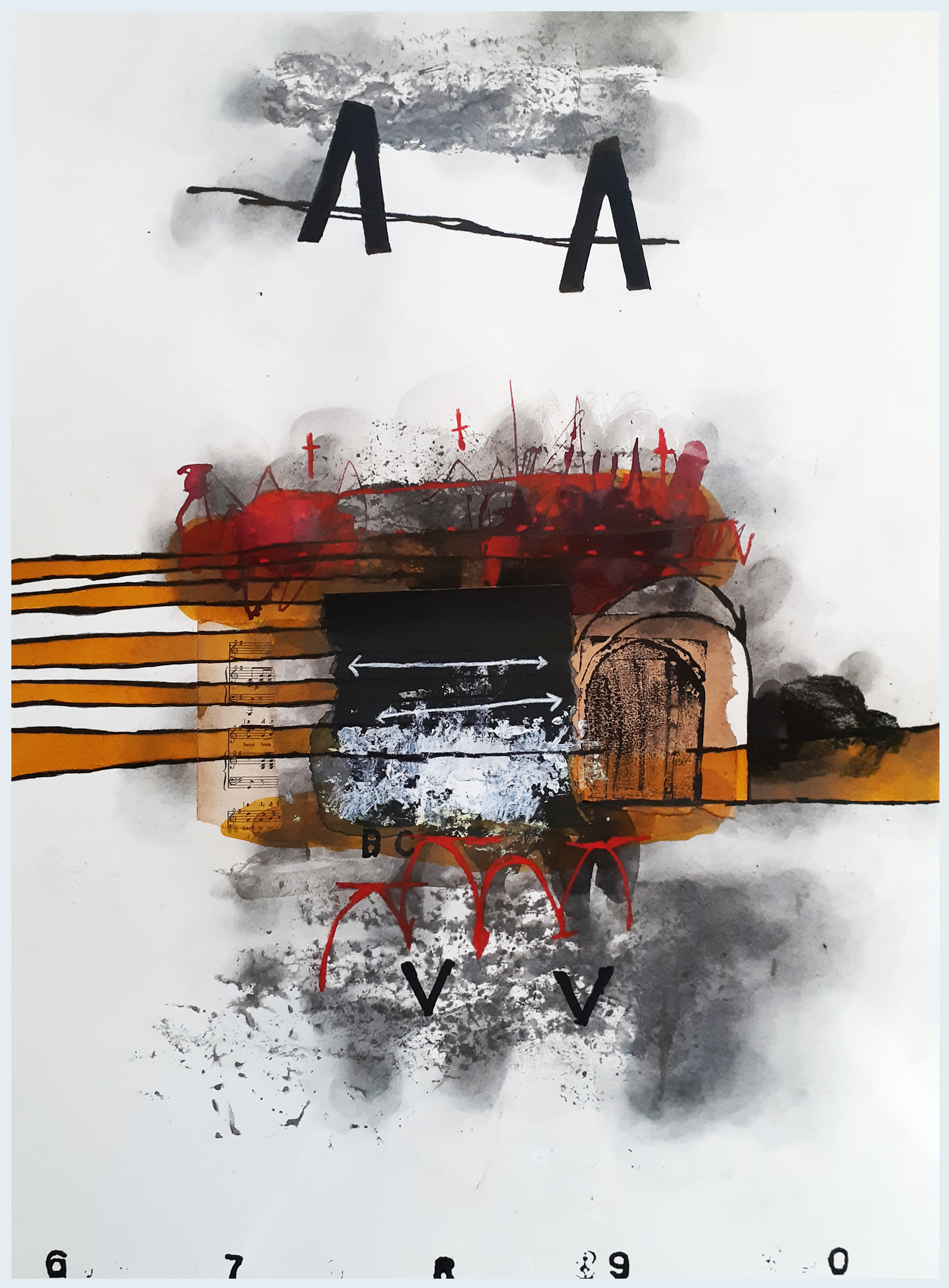“Composition No. 285 [Two Arrows]” is an original mixed media artwork created by G Kustom Kuhl. This work has been created on Saunders Waterford 425gsm paper with the use of pencils [various & layered], inks, paint, stencils, vintage printing plates and hand made from that have been relief printed. The work explores that notion of working from within to break barriers and levels to be on a constant growth momentum. The excitement of feeling the growth and emotion everyday.