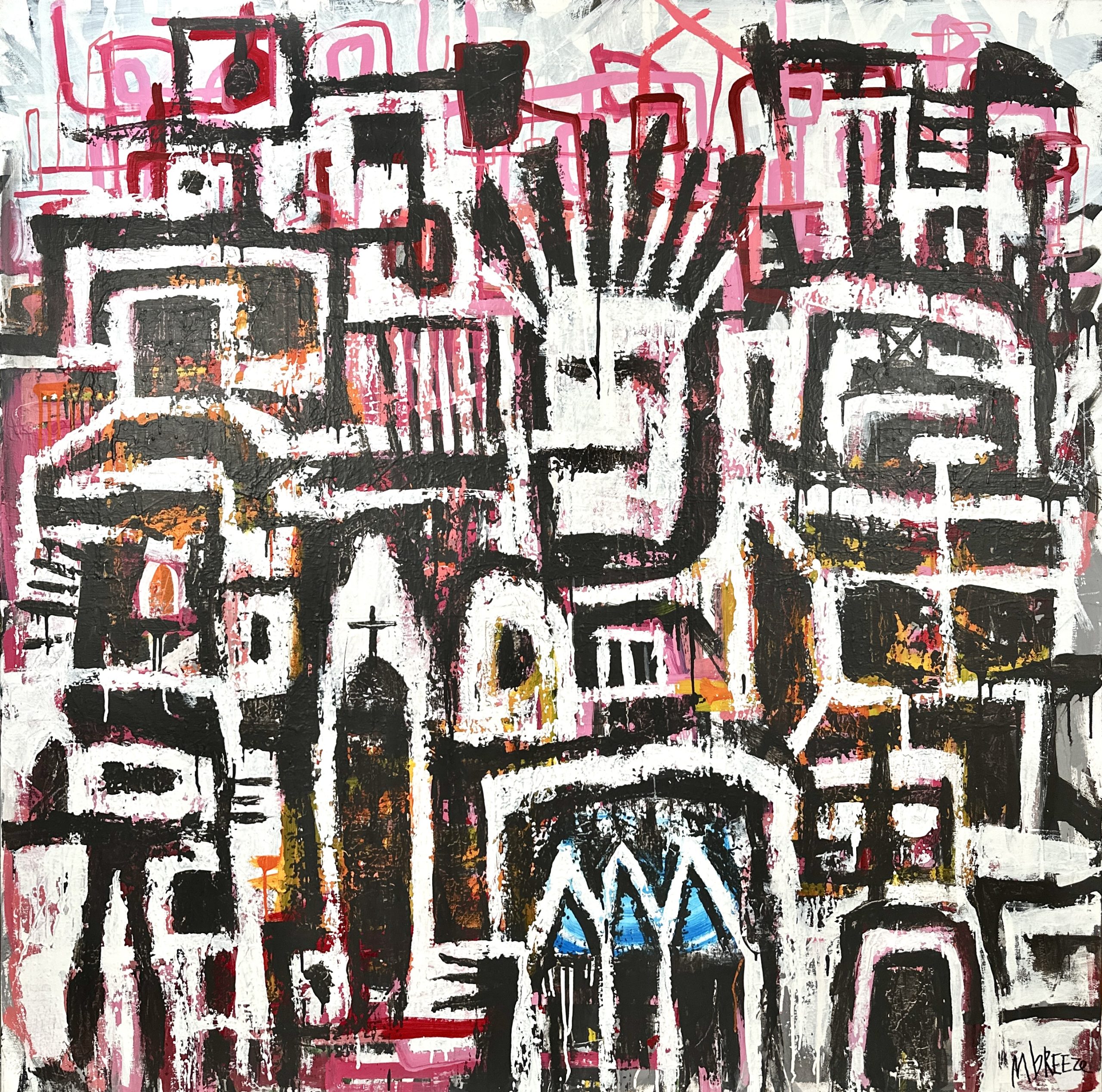 In creating this piece, I channelled my fascination with urban landscapes, symbolism, and the vibrant dance of life that cities embody. The bold lines and animated strokes in this painting capture the chaotic, yet rhythmic, pulse of city living. Using acrylics allowed me to layer and texture in a way that interestingly complements the intense juxtaposition of history and modernity, inviting viewers to explore depth, perspective, and the personal connections they find within urban environments. This artwork is intended to bring a surge of energy and contemplation to any space.