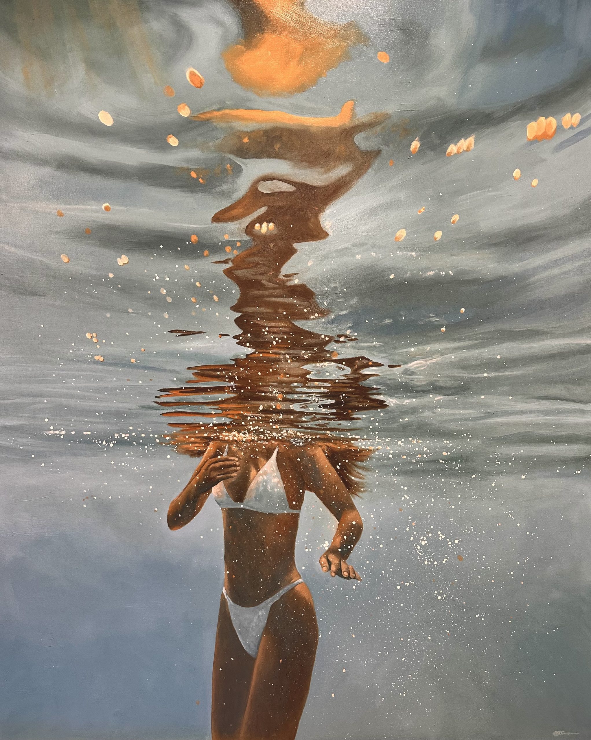 Confetti by Amanda Cameron – is one of a new series called ‘Salt Water’. While still exploring the interaction and connection between water, light and form, this series also analyses the sense of disquiet when swimming in deep ocean water. At the same time, the main focus is the quest for refuge, quietness and escapism. These paintings juxtapose the lone swimmer and a few minutes of introspection when alone in deep water against the fear of the unknown. The constant struggle between hyper-realism and having a painterly quality to my work is a conflict I always try to balance; therefore, thick paint and evident brush strokes are present when viewed up close. This piece is painted in professional oil paints on a museum-quality canvas and finished with edges painted and varnish for protection. It comes ready to hang and includes a certificate of authenticity.