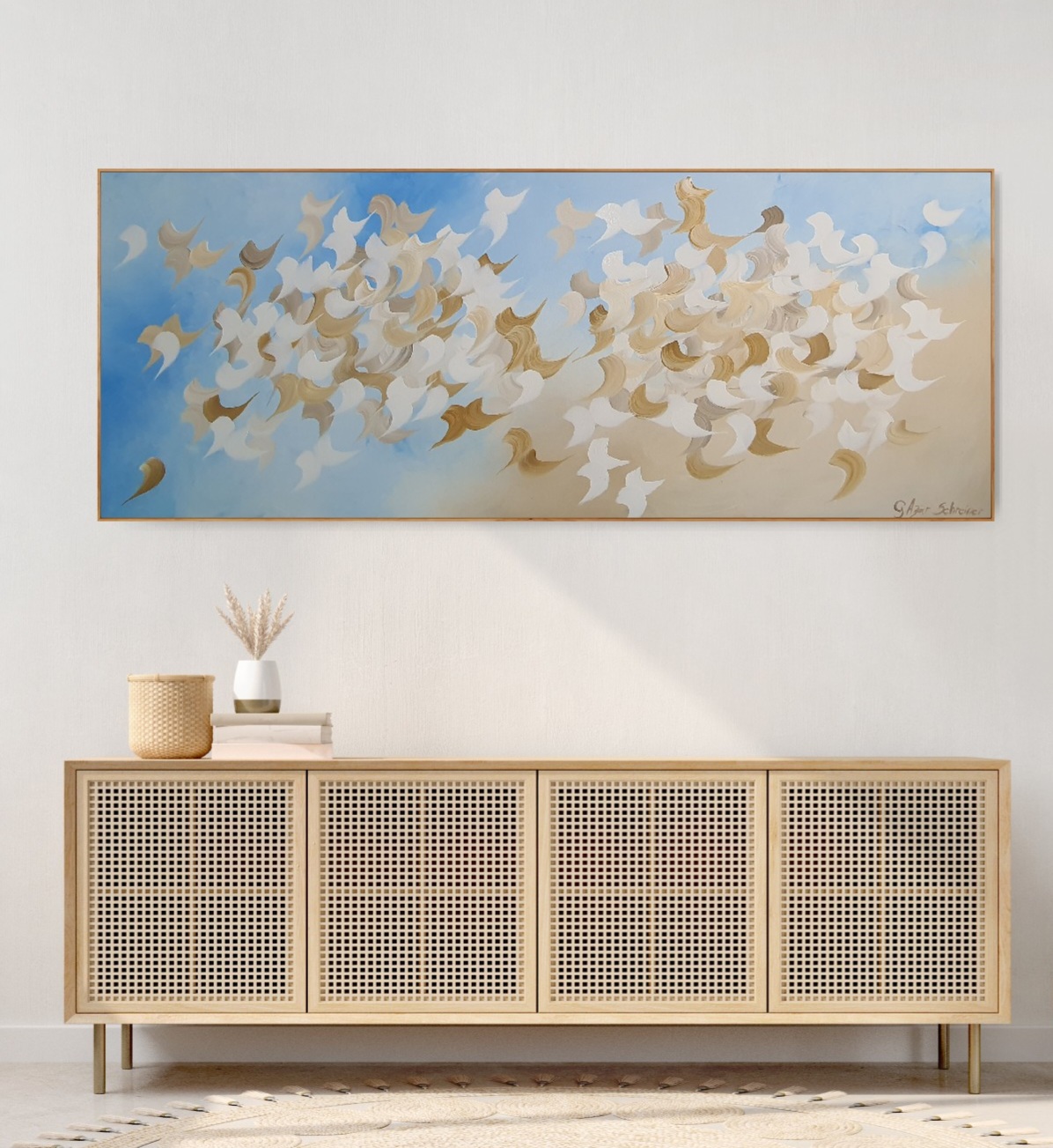 The painting doesn’t come with the external frame. The images attached are representations of what it could look like after being framed. No hanging wire.