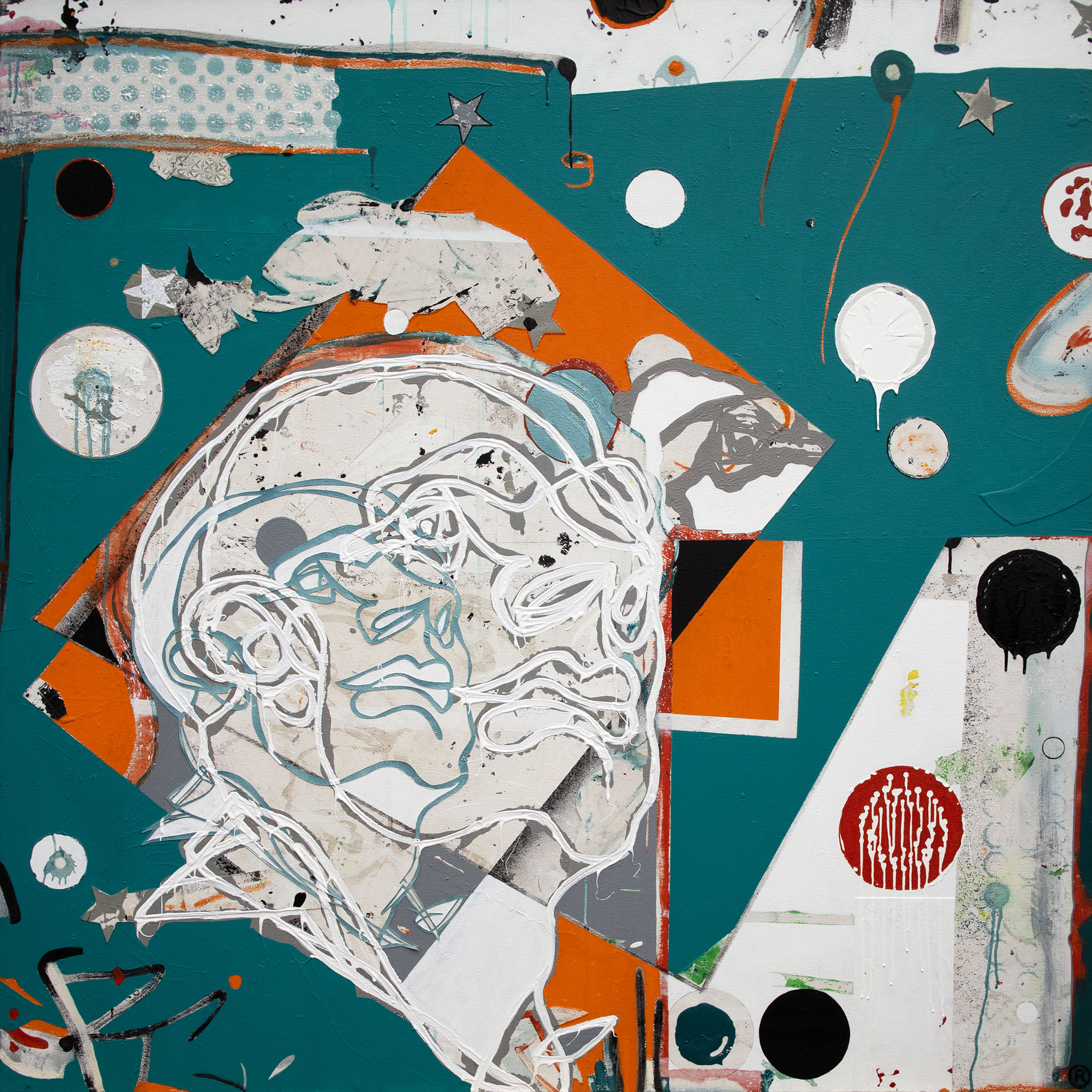Mixed media – acrylic spray paint oil stick charcoal graphite and collage on canvasĀ