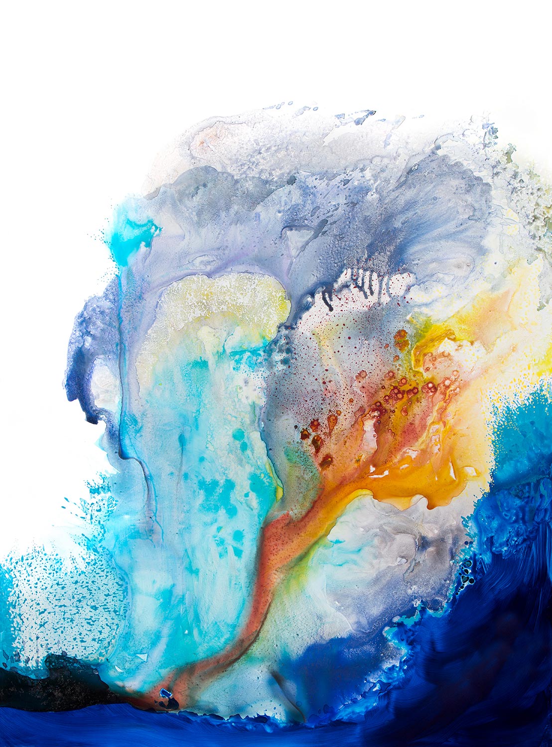 The textured gradients and iridescent overlays suggest shifting light and atmospheric depth, with delicate splatters and subtle variations in opacity adding to a sense of organic evolution. The contrast between cool and warm colour zones creates both tension and harmony, offering the viewer a contemplative space that hovers between abstraction and environmental reference. This work feels like a moment suspended, in the artist’s view of parallel worlds.