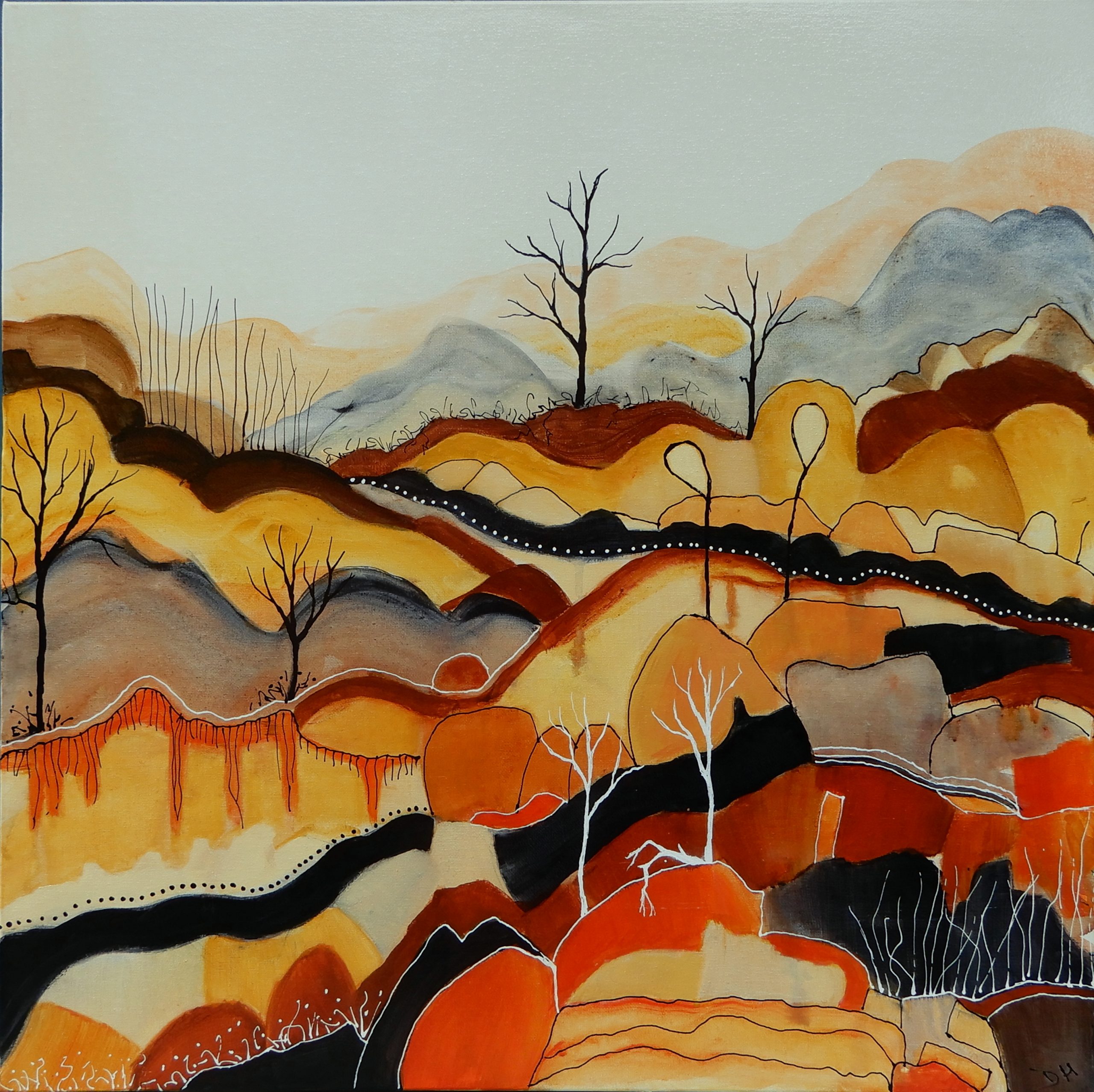 I love the adventure in the process of this body of work. Paint goes on the canvas very loosely with several different colours picked up on a watery brush: they mix and drip and then I begin to find the composition. These artworks are all made of memories of the landscapes I’ve been travelling through since I was a child.