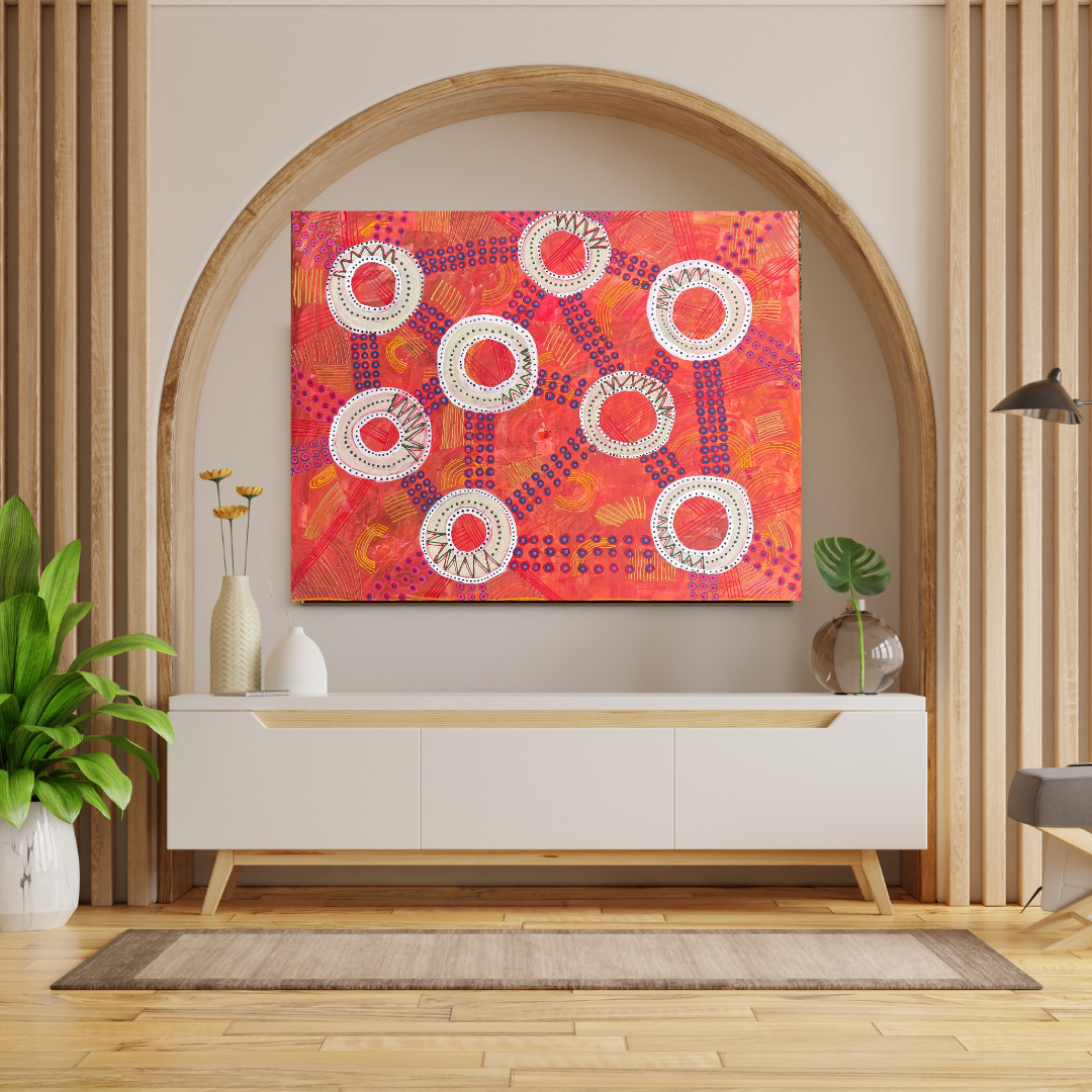 The dots are the reminder that nothing was by chance. All relationships were meant to be. The dots remind us we will always be connected. The red and orange background signifies mother earth. The warm earthly tones act as a reminder that she is always supporting us.