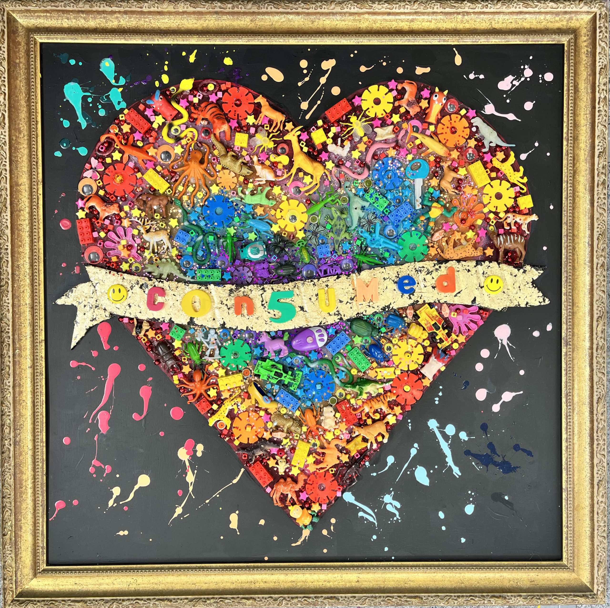 This original artwork is made using Recycled Plastic and Toys and set in a chunky vintage gold frame.