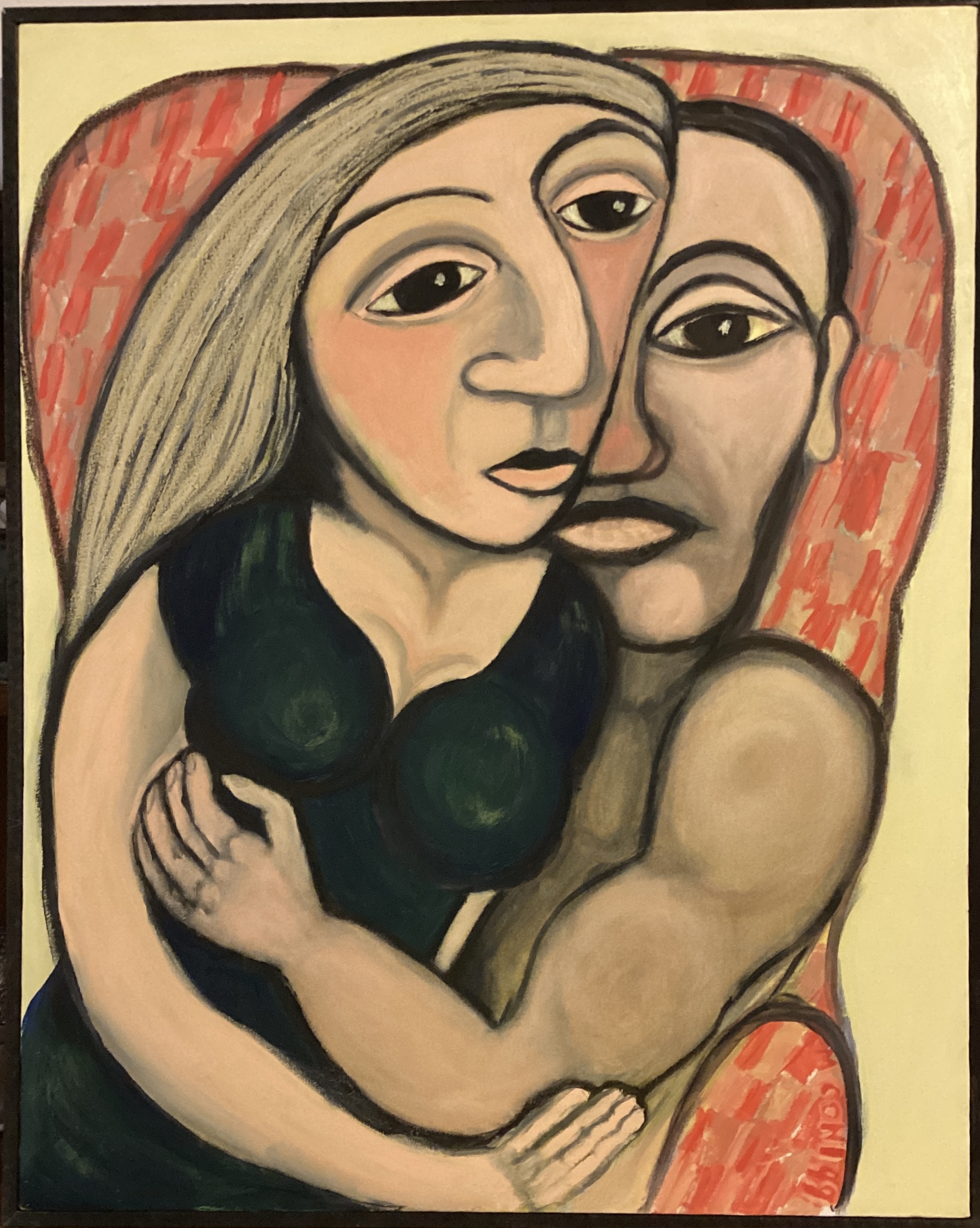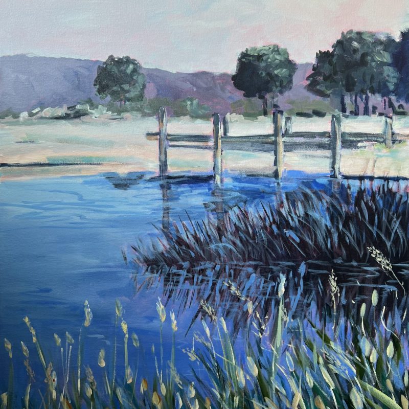 Margaret did this painting soon after starting to paint.At the time she was in an extremely stressful job and painting helped her to escape and survive. This painting appeared on the canvas and it helped Margaret to realise that this image really told her how much she dreaded returning to work after days off hence the title Contemplating Monday . The painting is on a stretch canvas and quality oil paints were used .The painting has been bordered with a thin black frame .It has D hooks and is ready to hang .