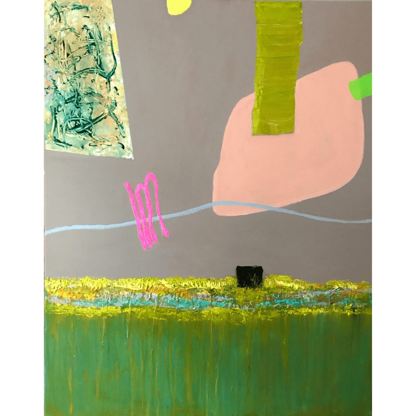 A roughly textured horizontal plane and suspended motifs contrast with smooth tones in an open field design showing saturated and neutral hues together in balanced harmony.