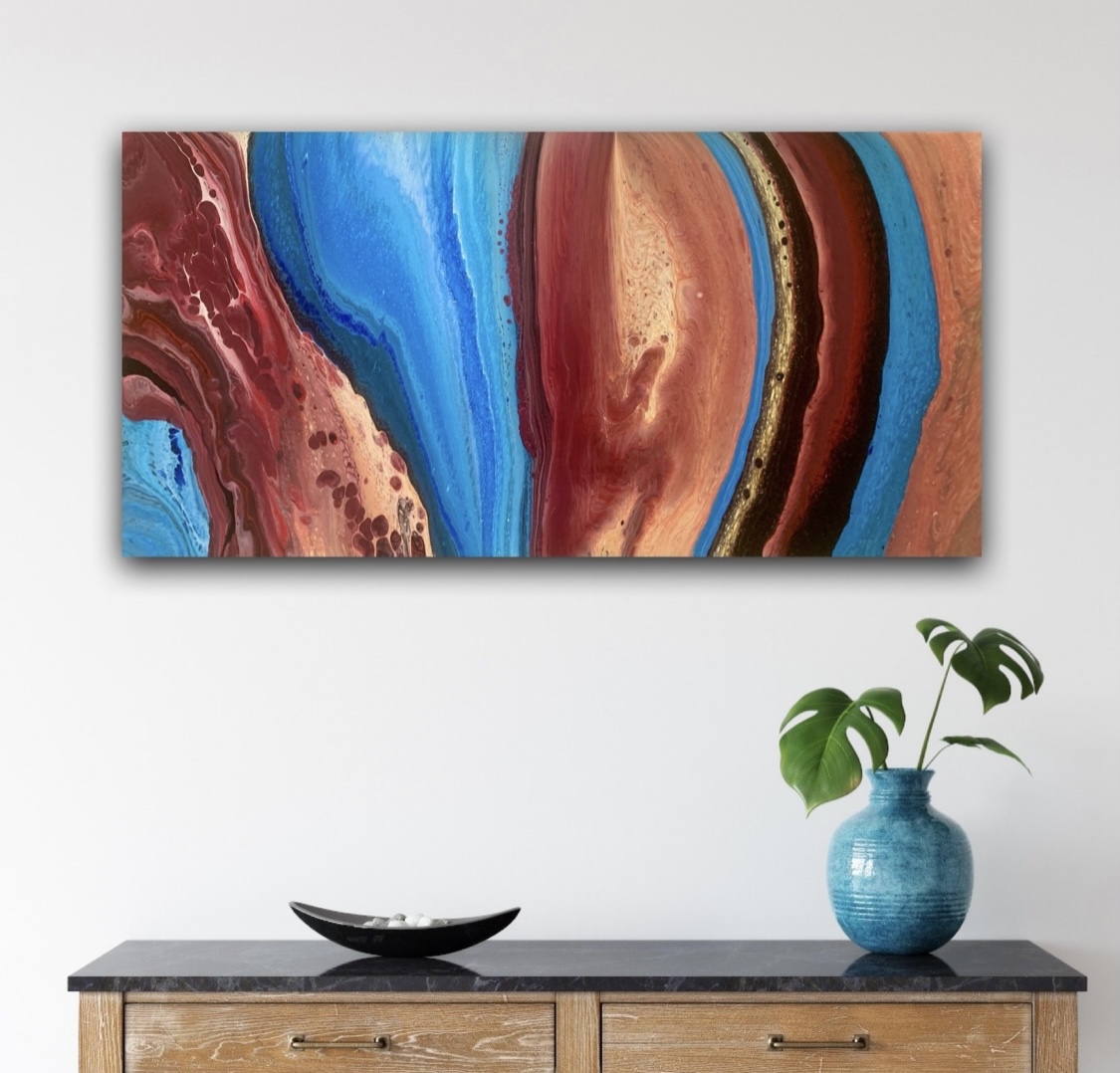 Contrast was created using various techniques combined to allow increased flow, interaction and separation of colours to create interesting patterns where pops of colour can be seen emerging from underneath. This added dimension adds lace and cells to the artwork creating an interesting and one of a kind painting that can never be replicated.