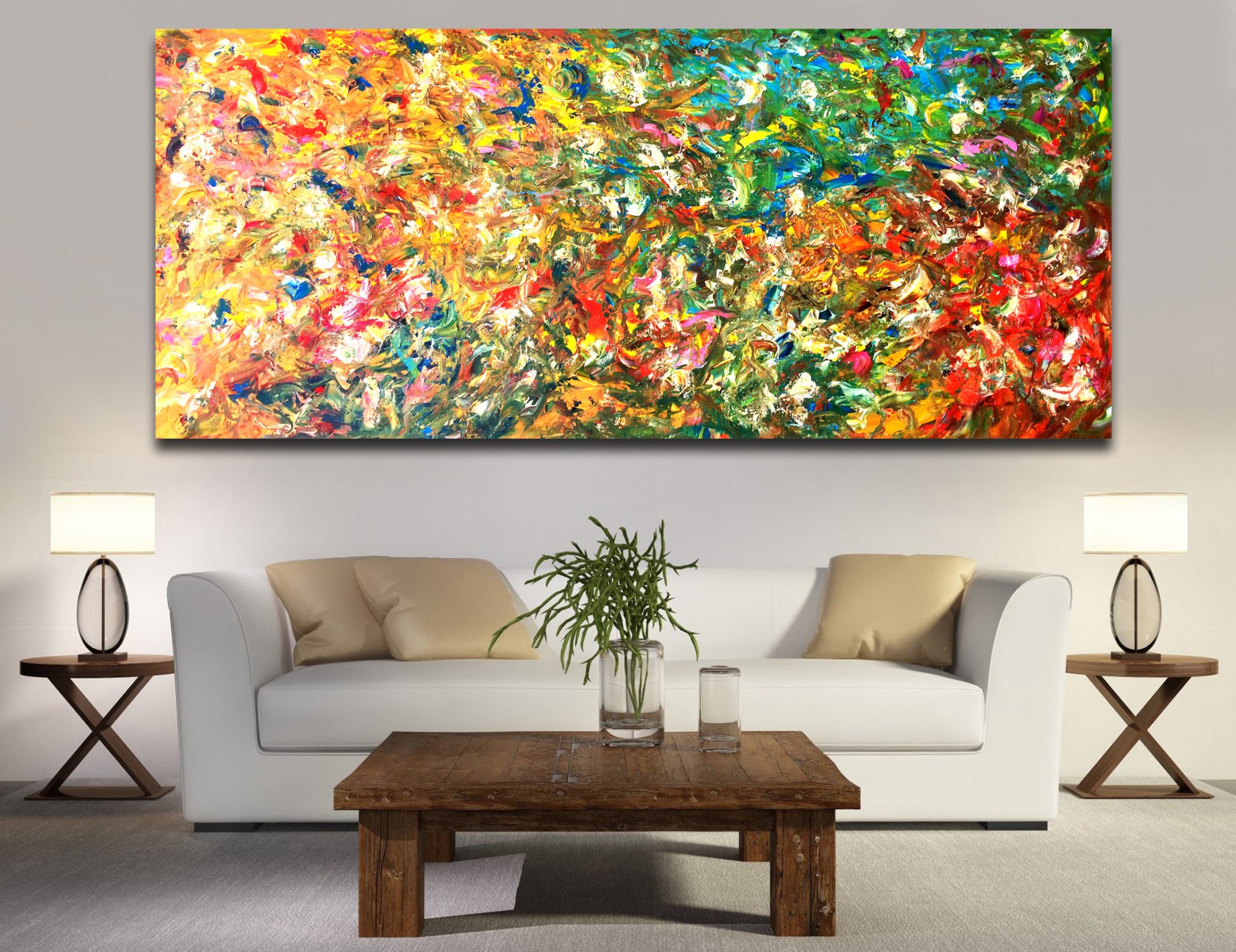In the photos, where the painting is shown mounted on a wall, these are purely for illustrative purposes. You should review the dimension of the artwork to be sure the work suits your needs. In the case when a painting is sold without a frame, of course, you can add a frame of your choosing and so it will add to the overall dimensions.